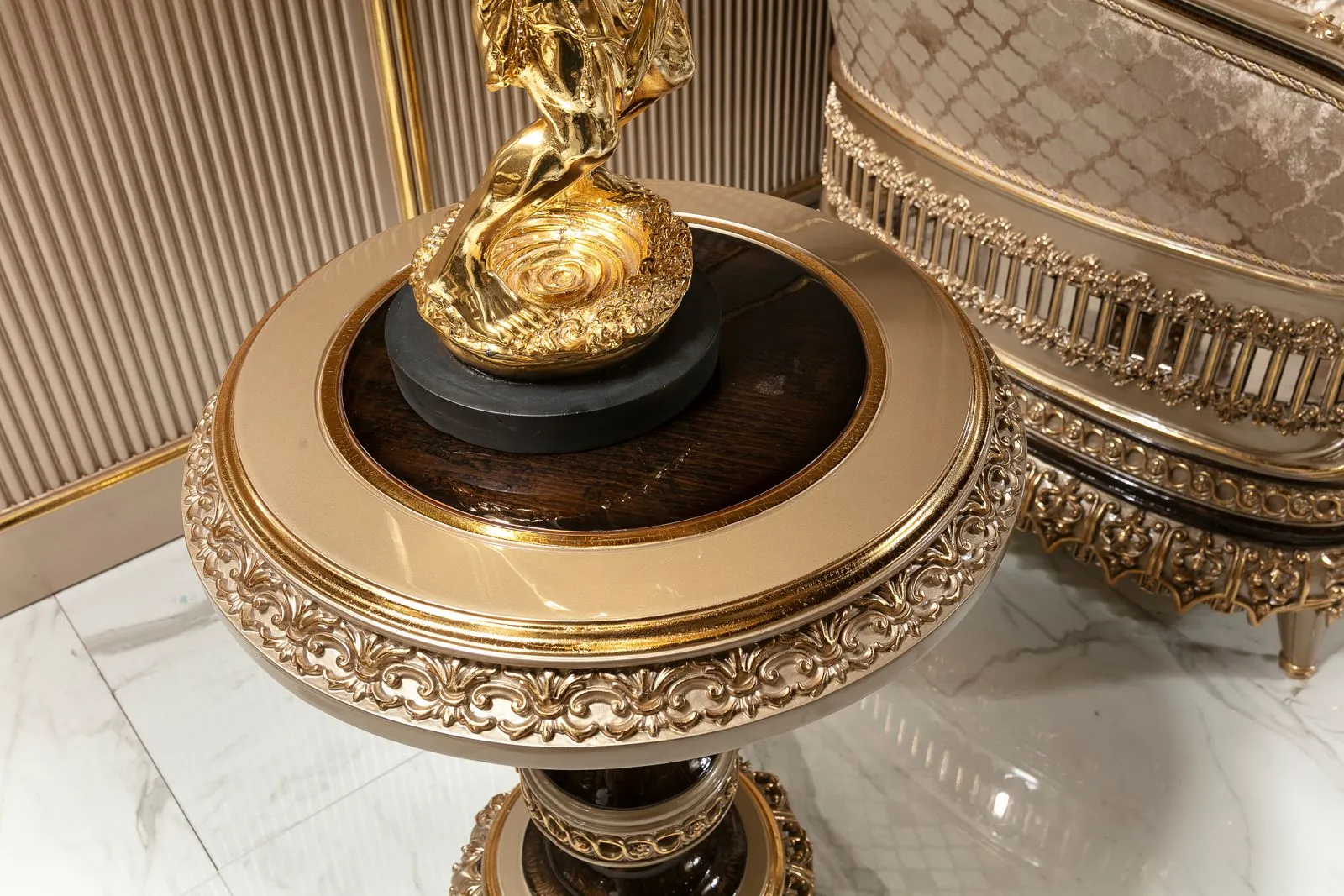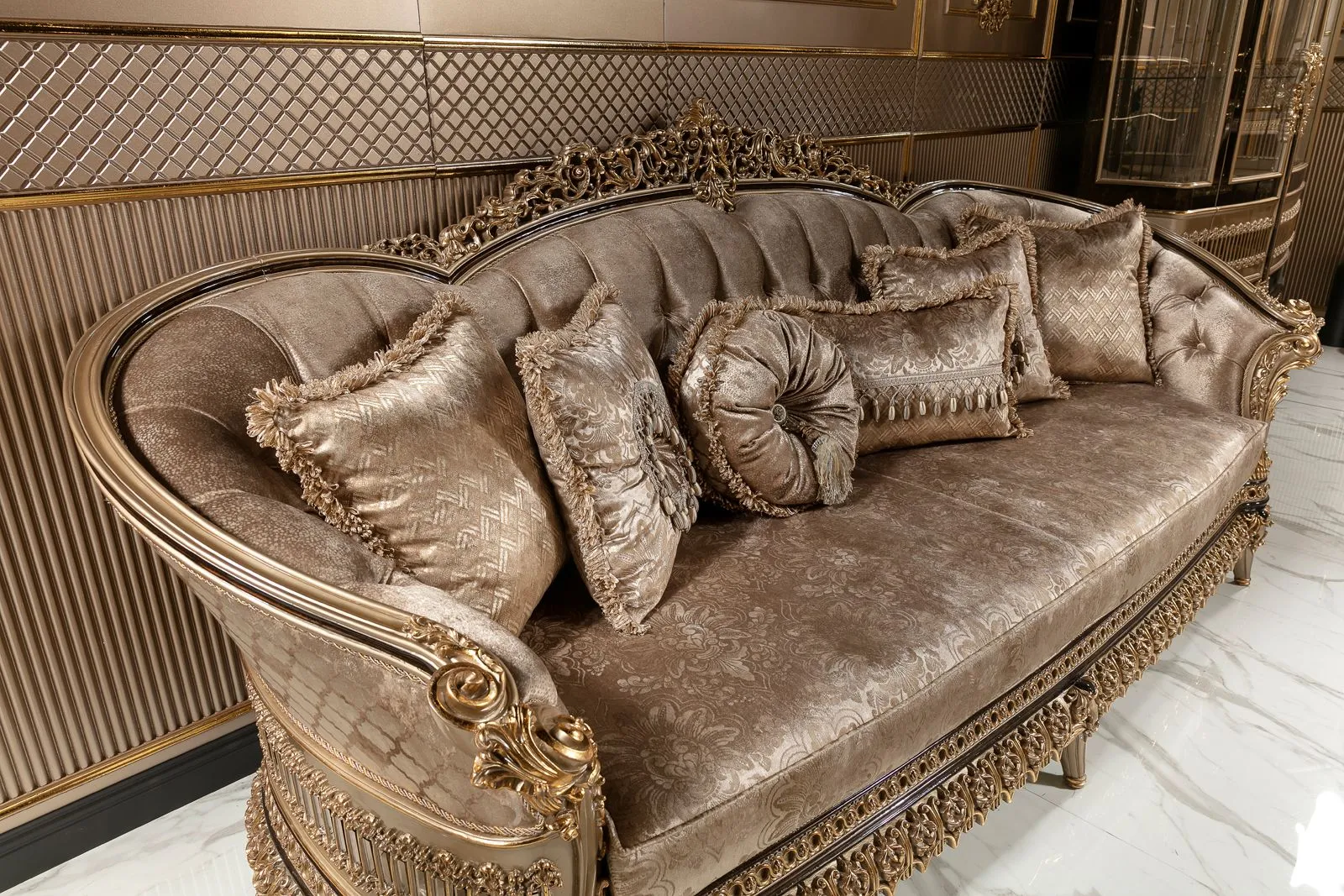 El işçiliğinin en ince örnekleriyle süslenmiş bu özel koltuk takımı, zengin desenli kumaşları ve altın varak detayları ile dikkat çekiyor. Konforlu yapısı, geniş oturma alanları ve ergonomik tasarımıyla hem günlük kullanımda hem de özel davetlerde rahatlığı en üst seviyede sunar. Empire Koltuk Takımı, klasik estetiği ve lüks yaşam tarzını bir arada yaşamak isteyenler için mükemmel bir seçimdir.