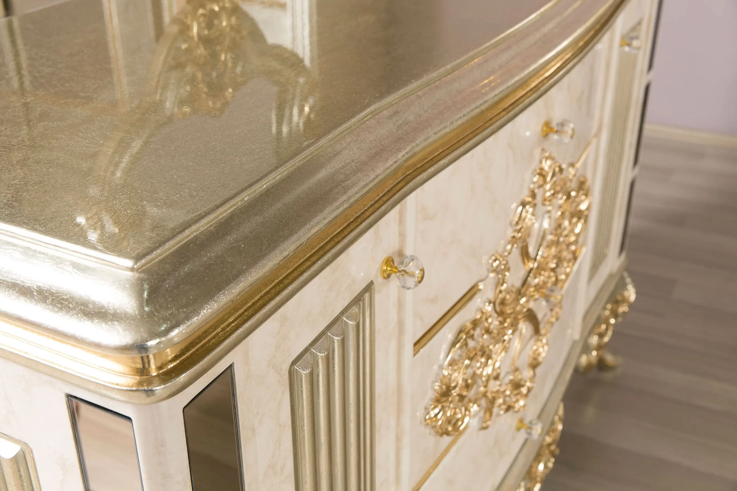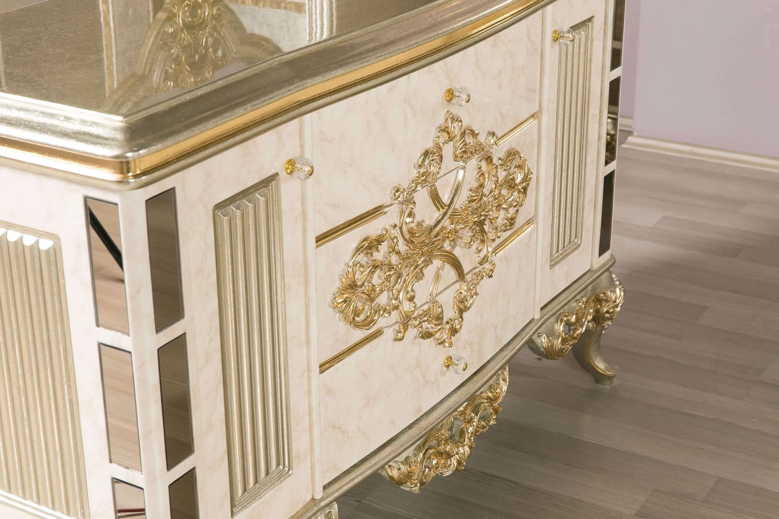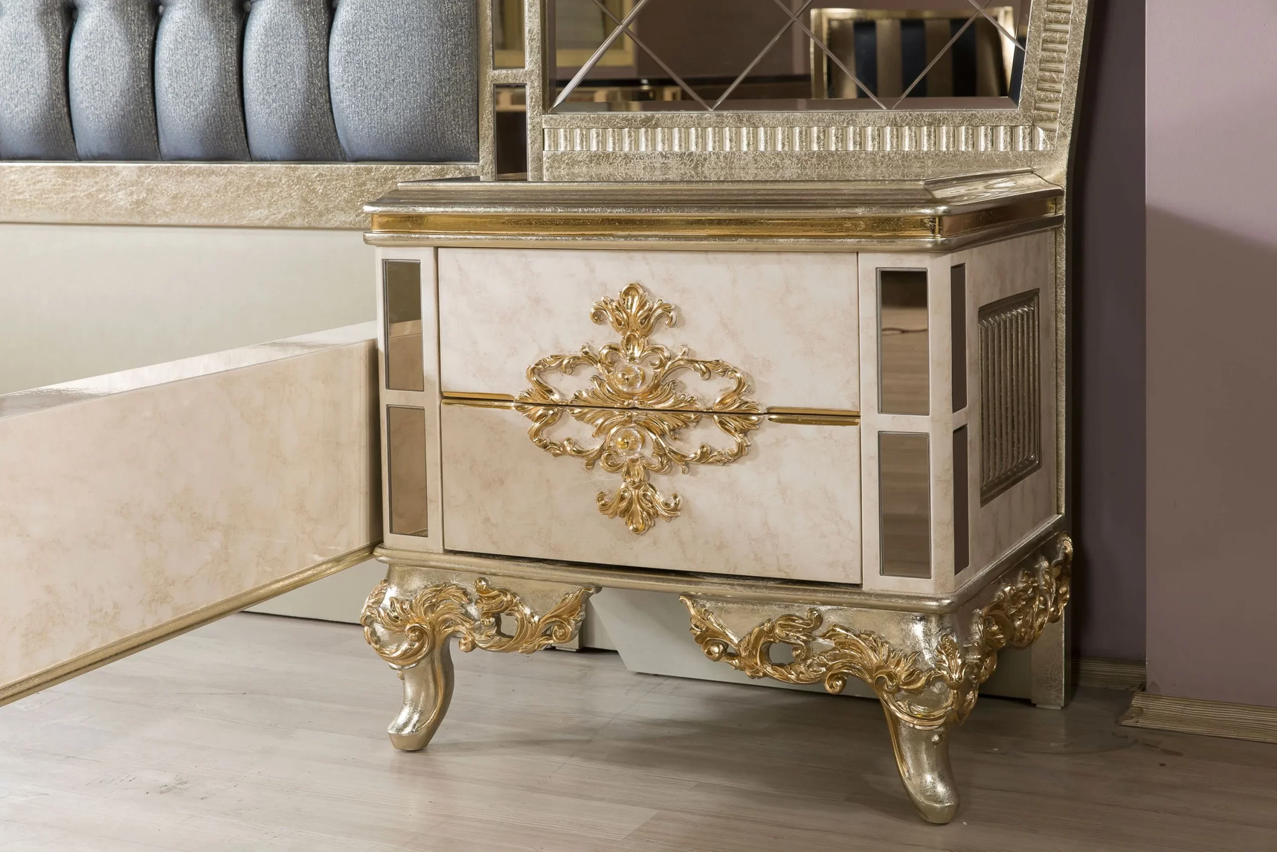 Göz alıcı yatak başlığı ve zarif işçilikle süslenmiş mobilya parçaları, Hanedan Yatak Odası Takımı’nı eşsiz kılar. Geniş ve gösterişli dolapları, kullanışlı şifonyeri ve şıklığıyla dikkat çeken komodinleriyle bu takım, sadece estetik bir değer sunmakla kalmaz, aynı zamanda fonksiyonel bir yaşam alanı yaratır. Kraliyet zarafetini her ayrıntısında hissettiren bu yatak odası takımı, size hem rahatlık hem de görsel bir şölen sunacak şekilde tasarlandı.