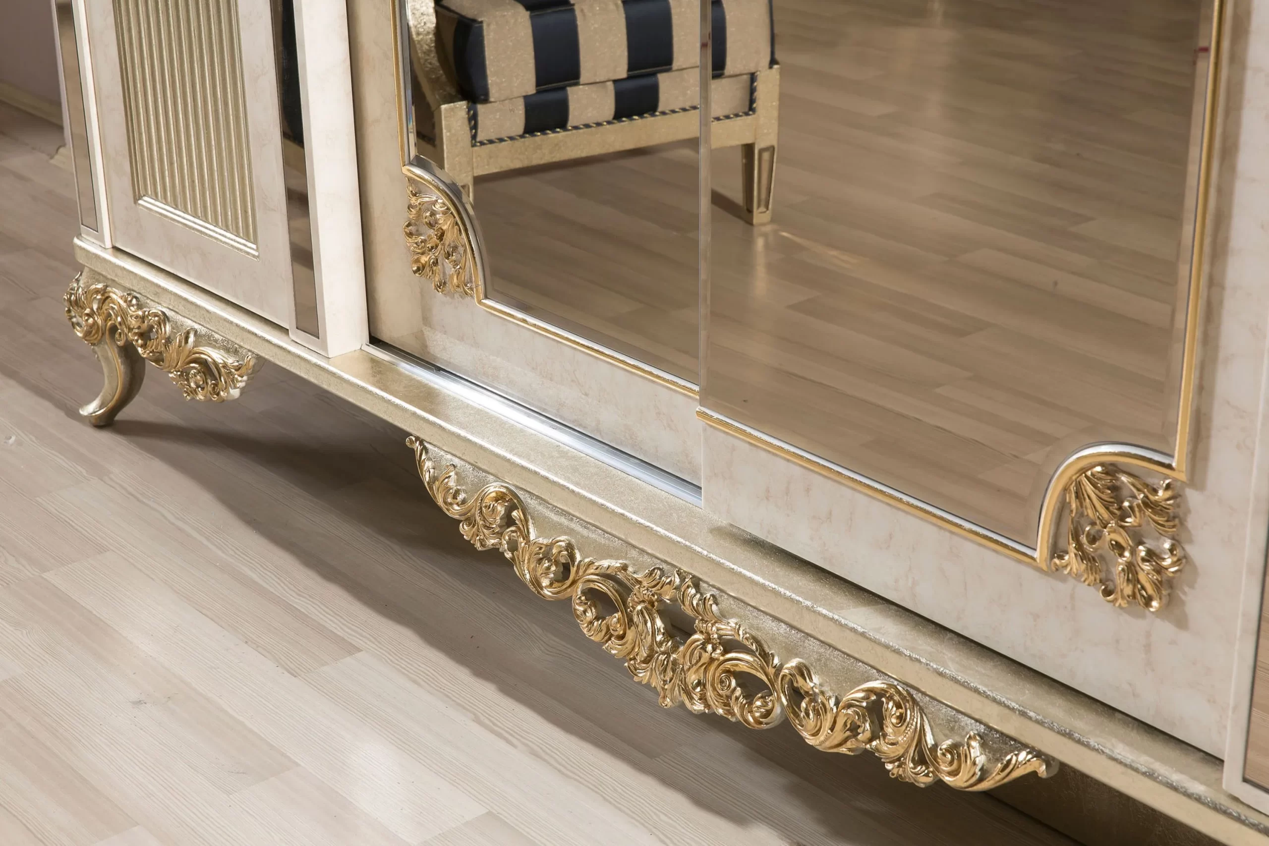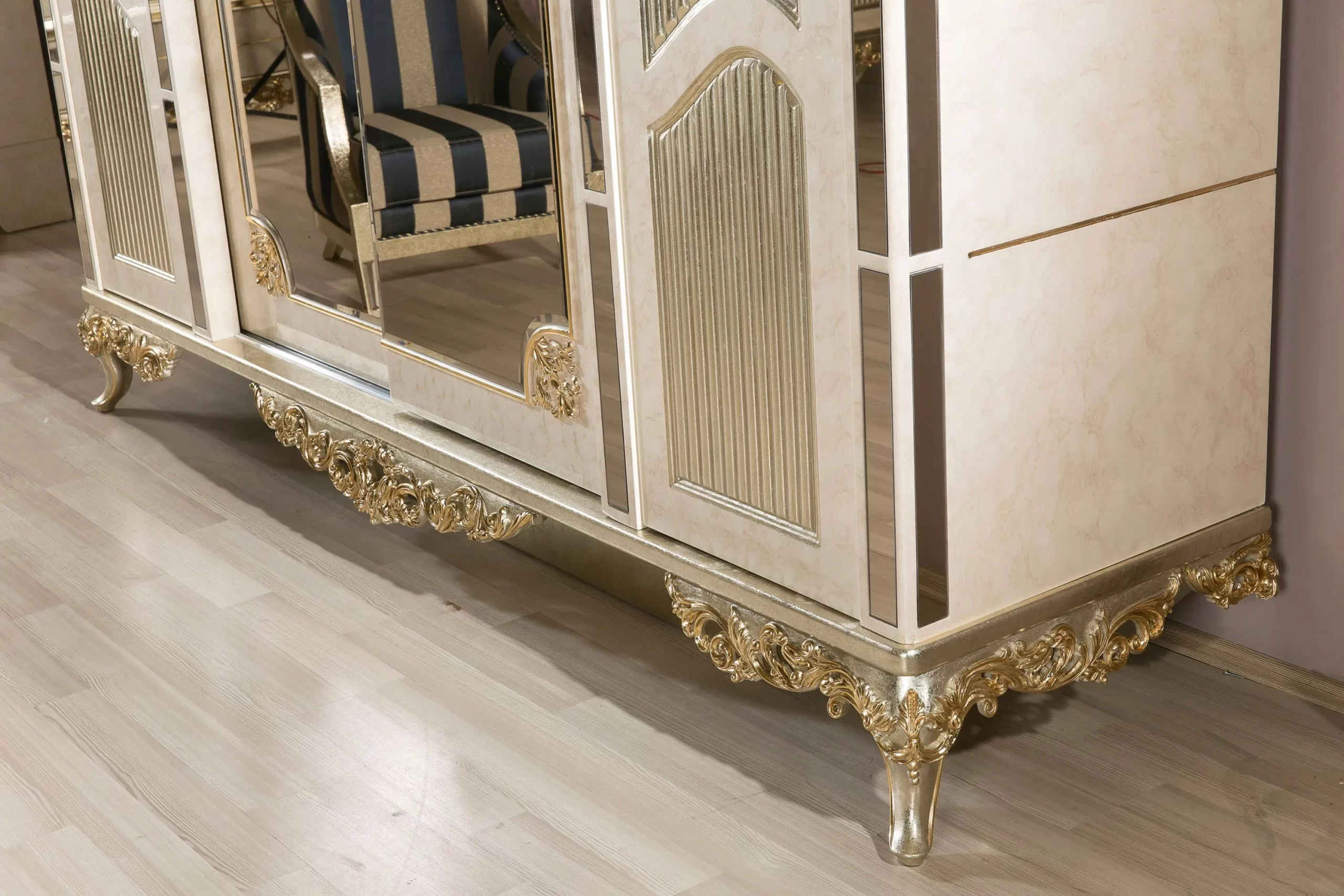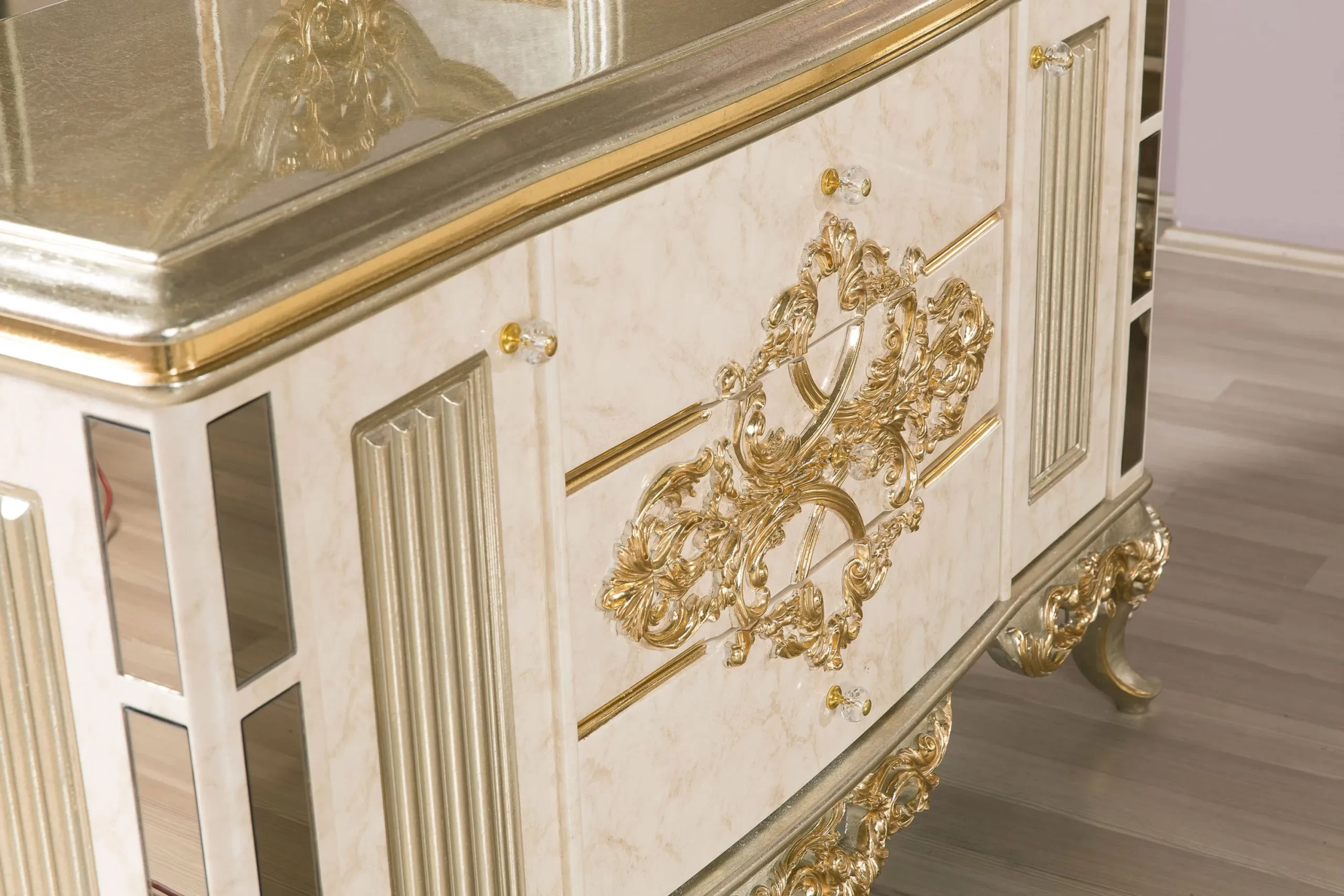 Göz alıcı yatak başlığı ve zarif işçilikle süslenmiş mobilya parçaları, Hanedan Yatak Odası Takımı’nı eşsiz kılar. Geniş ve gösterişli dolapları, kullanışlı şifonyeri ve şıklığıyla dikkat çeken komodinleriyle bu takım, sadece estetik bir değer sunmakla kalmaz, aynı zamanda fonksiyonel bir yaşam alanı yaratır. Kraliyet zarafetini her ayrıntısında hissettiren bu yatak odası takımı, size hem rahatlık hem de görsel bir şölen sunacak şekilde tasarlandı.