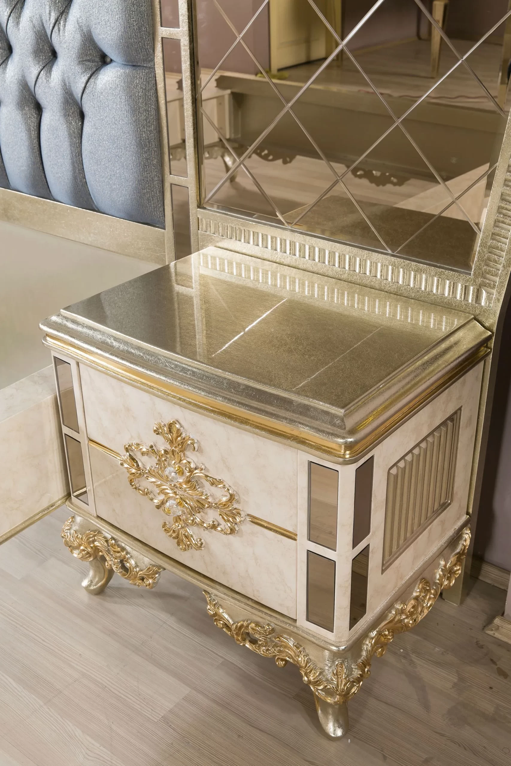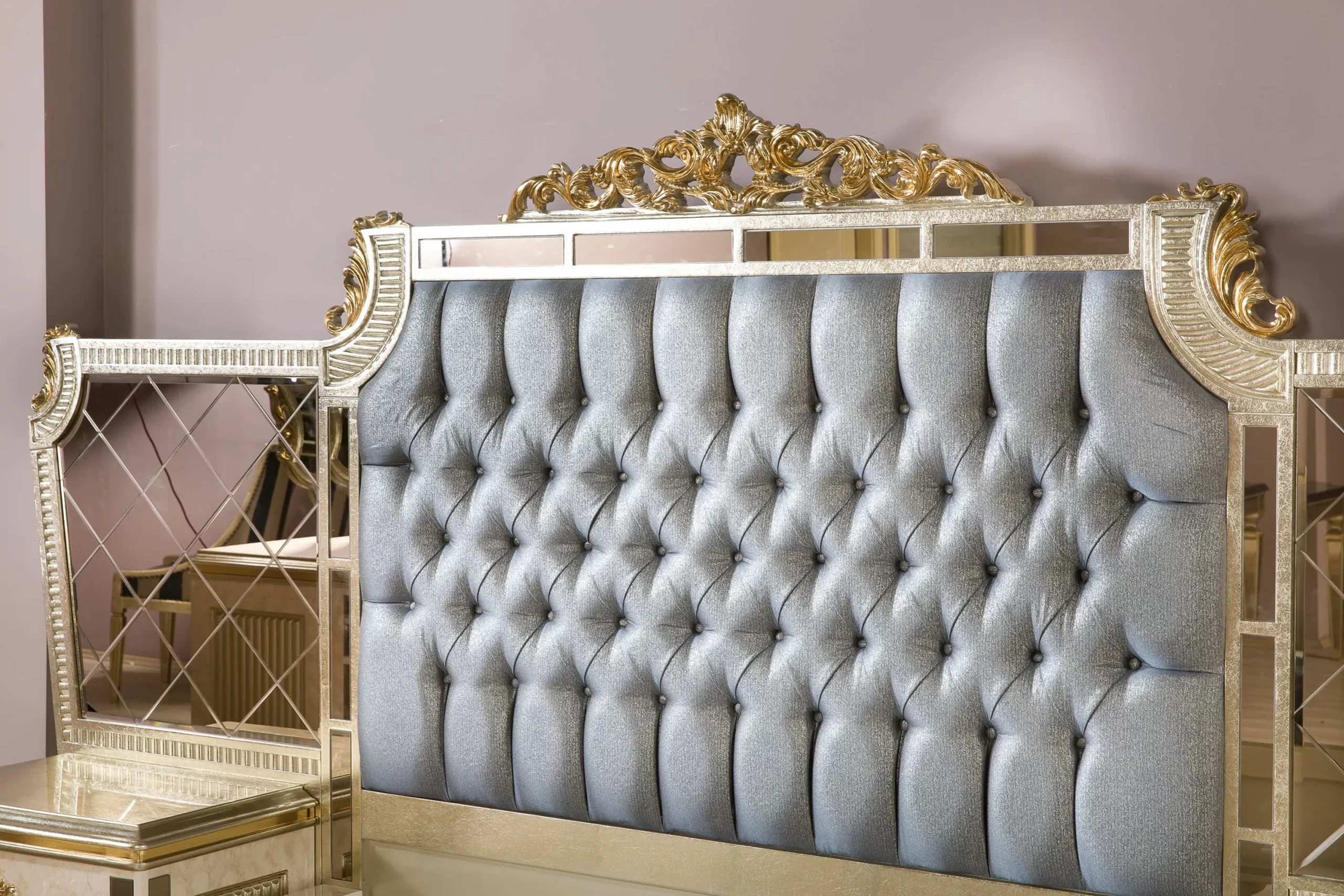 Lüks ve zarafetin buluştuğu Hanedan Yatak Odası Takımı, evinizde prestijli bir hava estirirken, konforlu ve huzurlu bir uyku deneyimini de garanti eder.