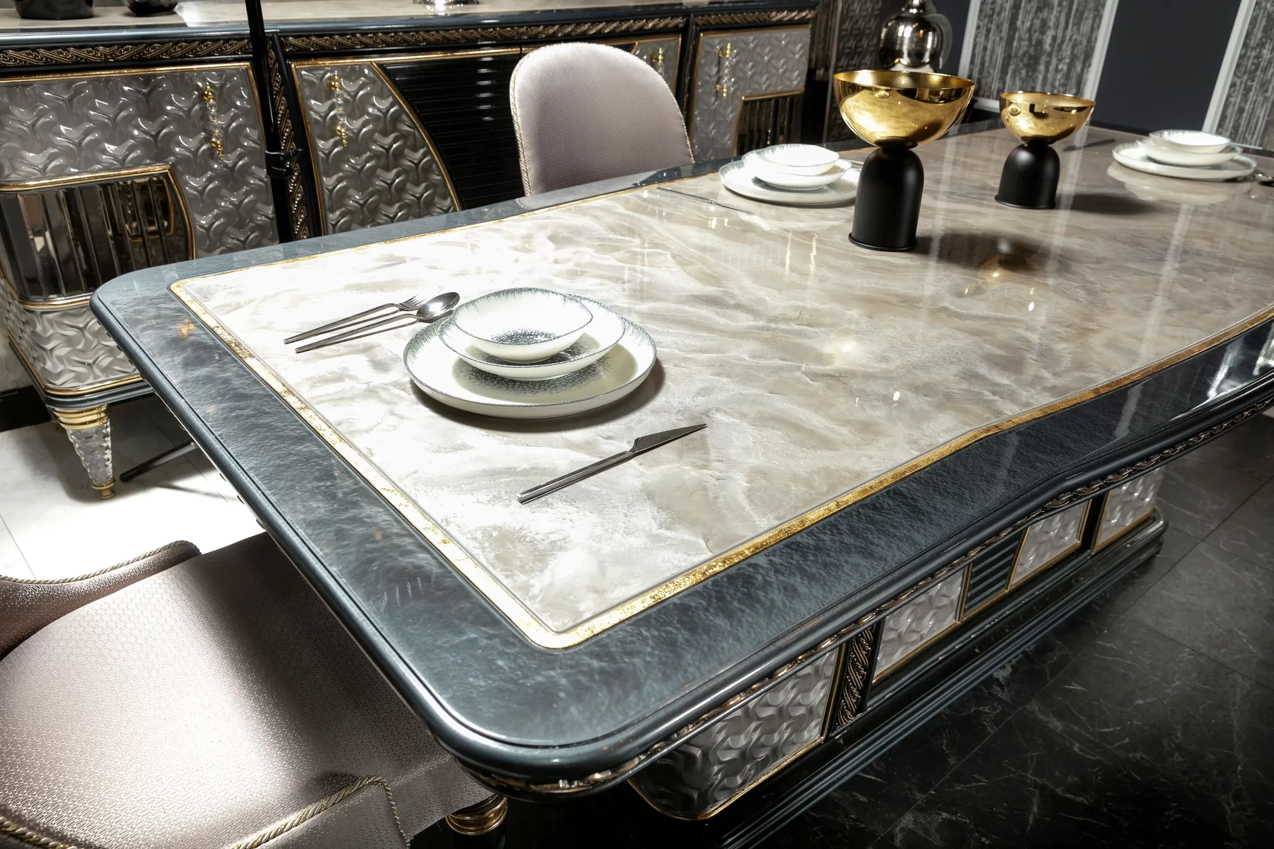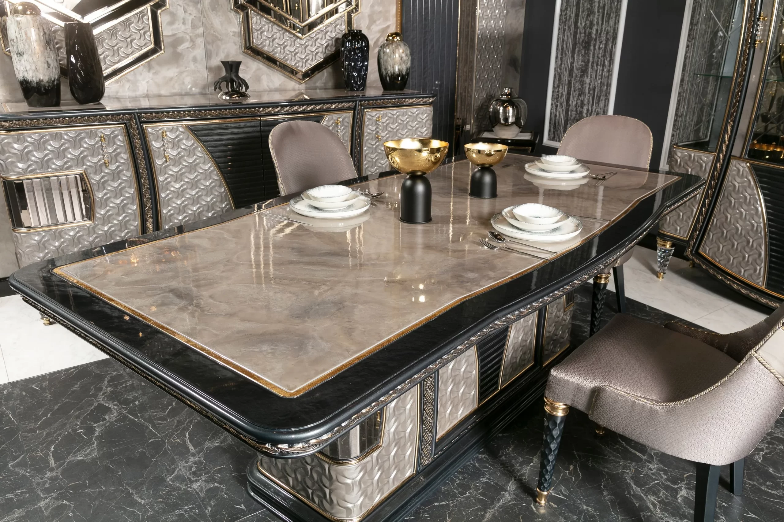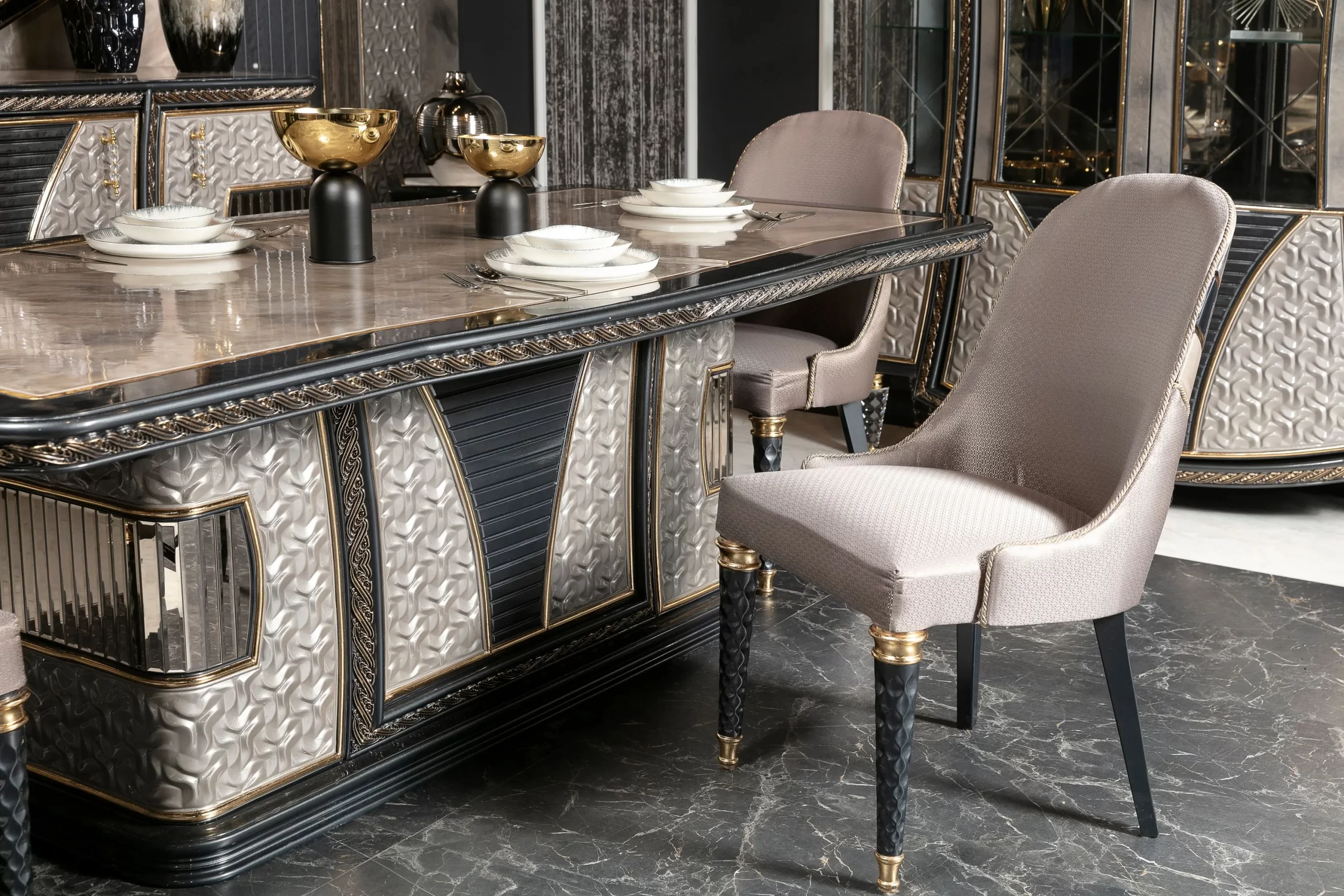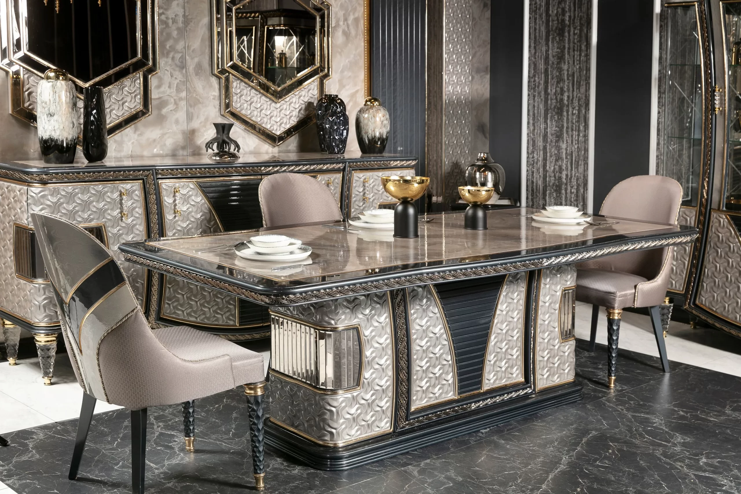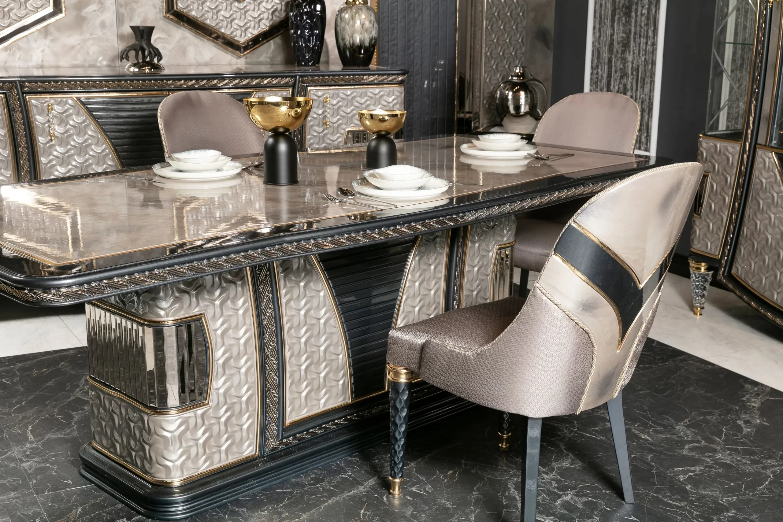 Geniş yemek masası, misafirlerinizi rahatlıkla ağırlayabileceğiniz geniş bir alan sunarken, ergonomik ve zarif sandalyeler konforlu bir oturma deneyimi sağlar. Takıma eşlik eden kristal detaylarla süslenmiş konsol ve vitrin, hem dekoratif hem de işlevsel çözümler sunar, eşyalarınızı şık bir şekilde sergileyebilmenize olanak tanır.