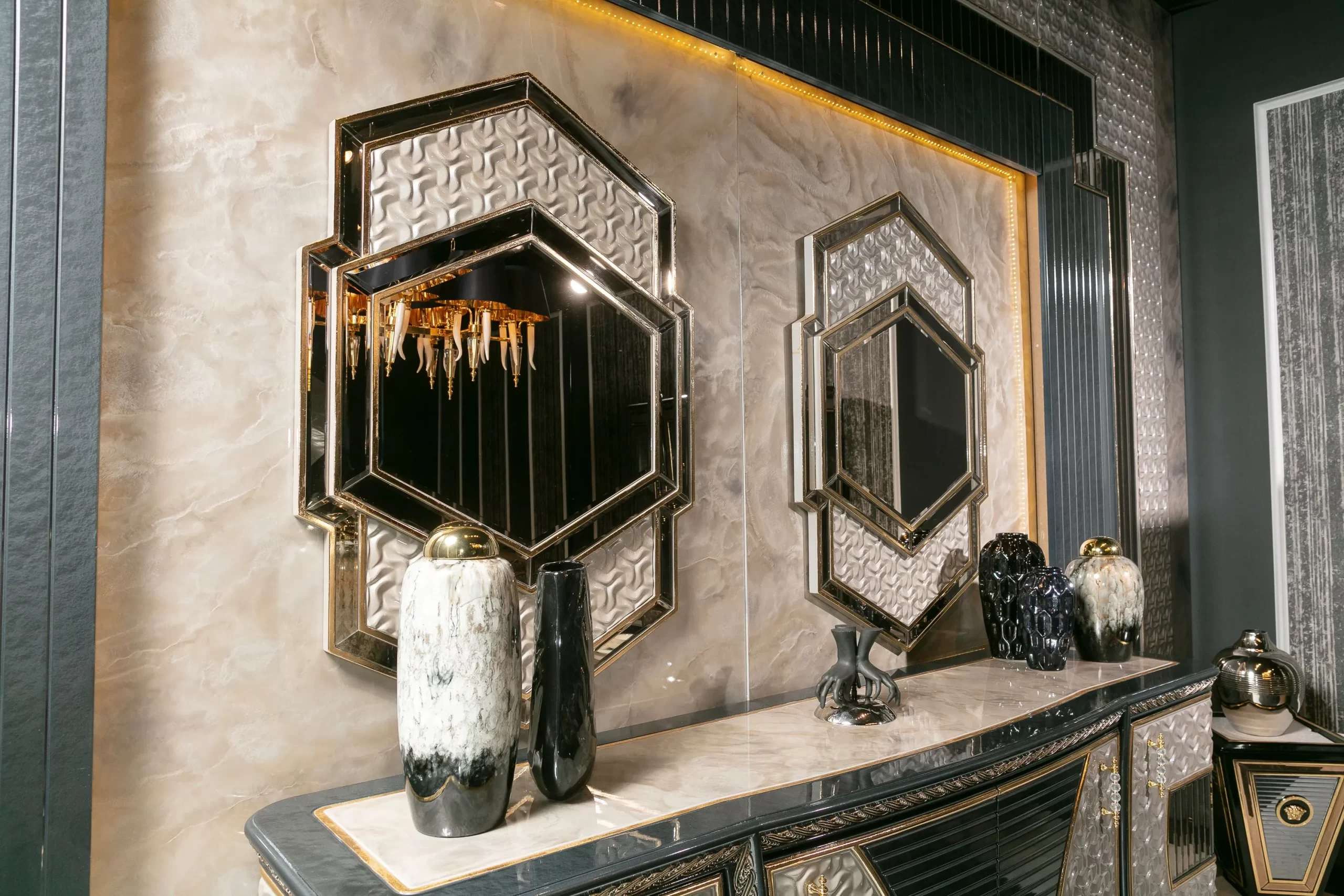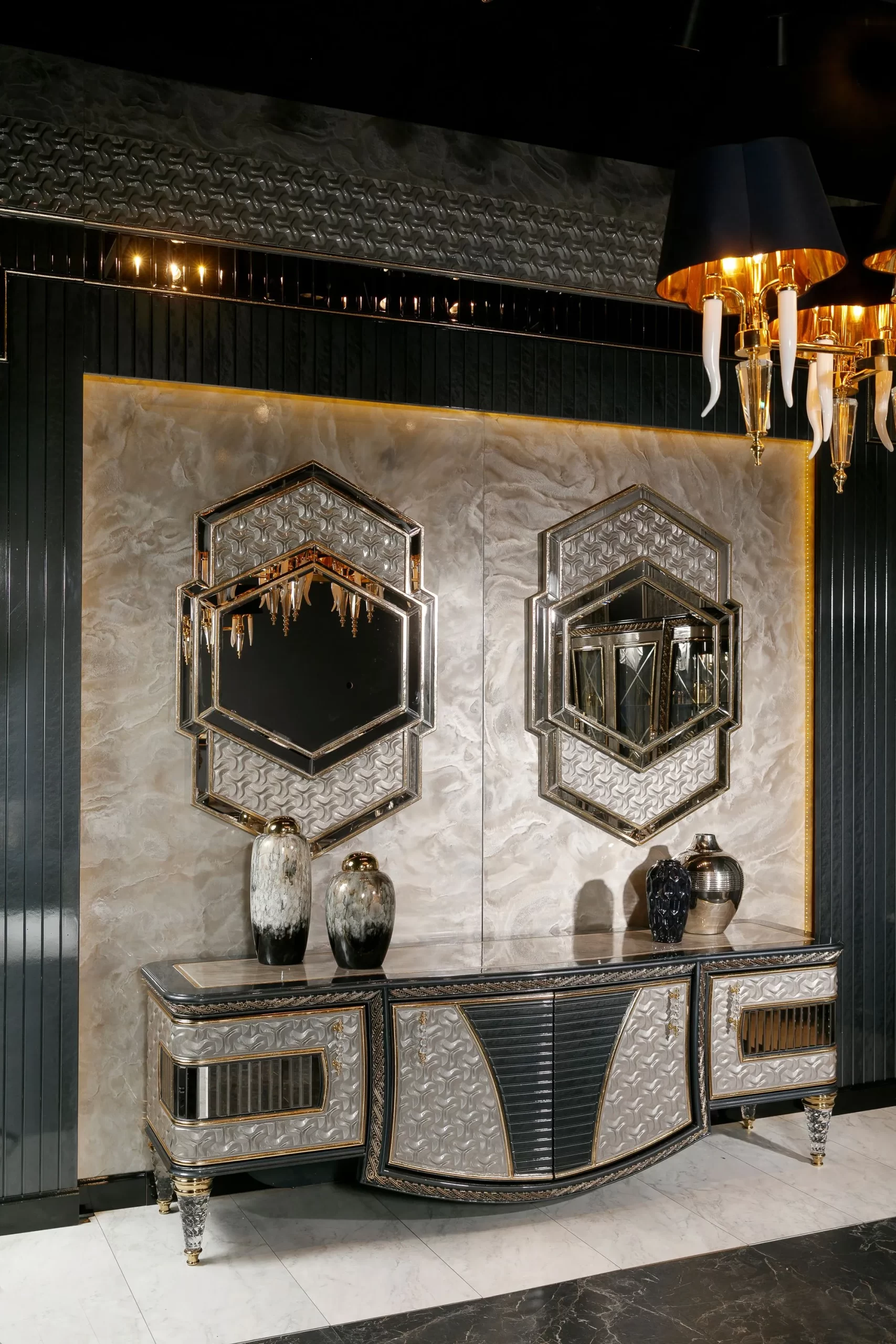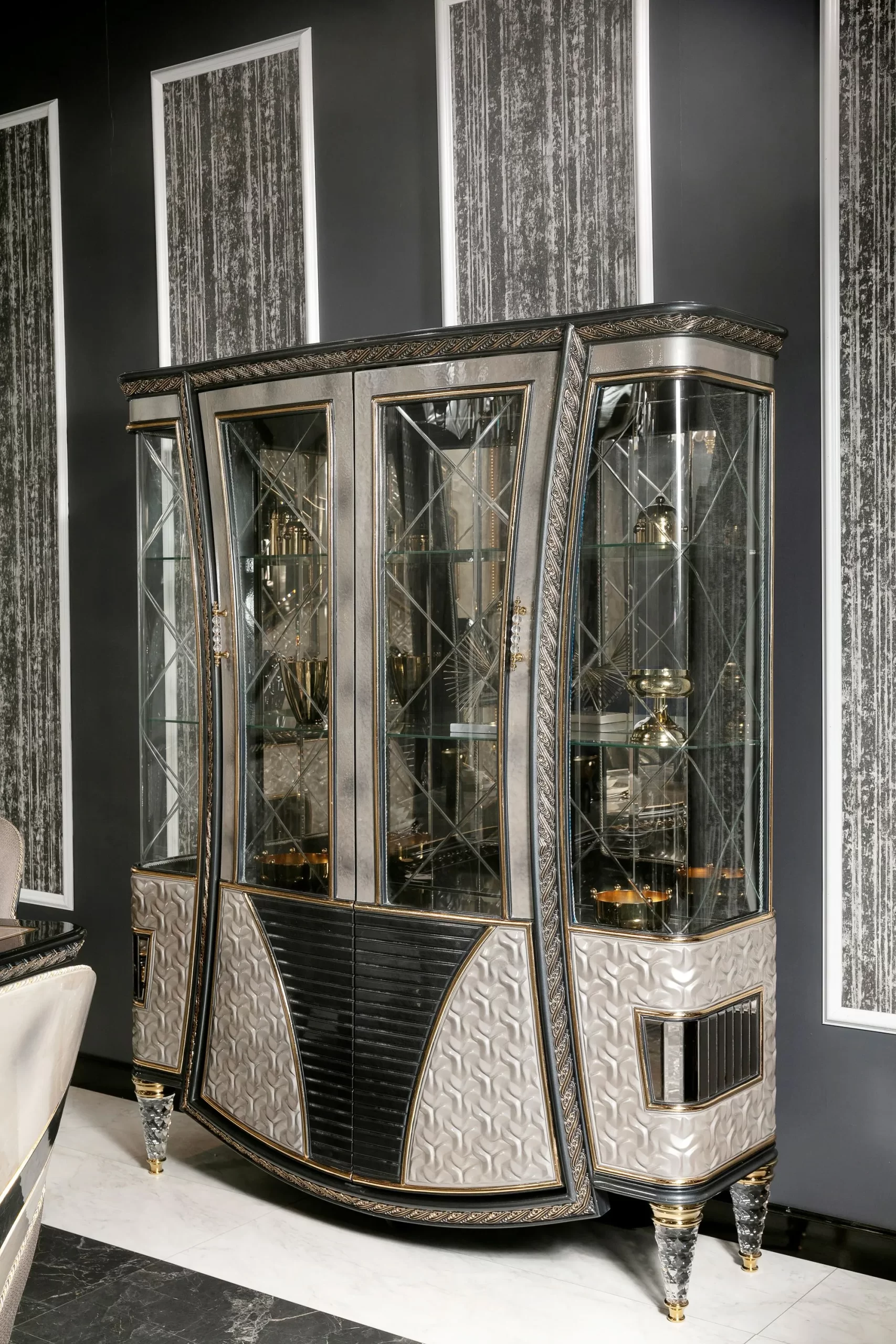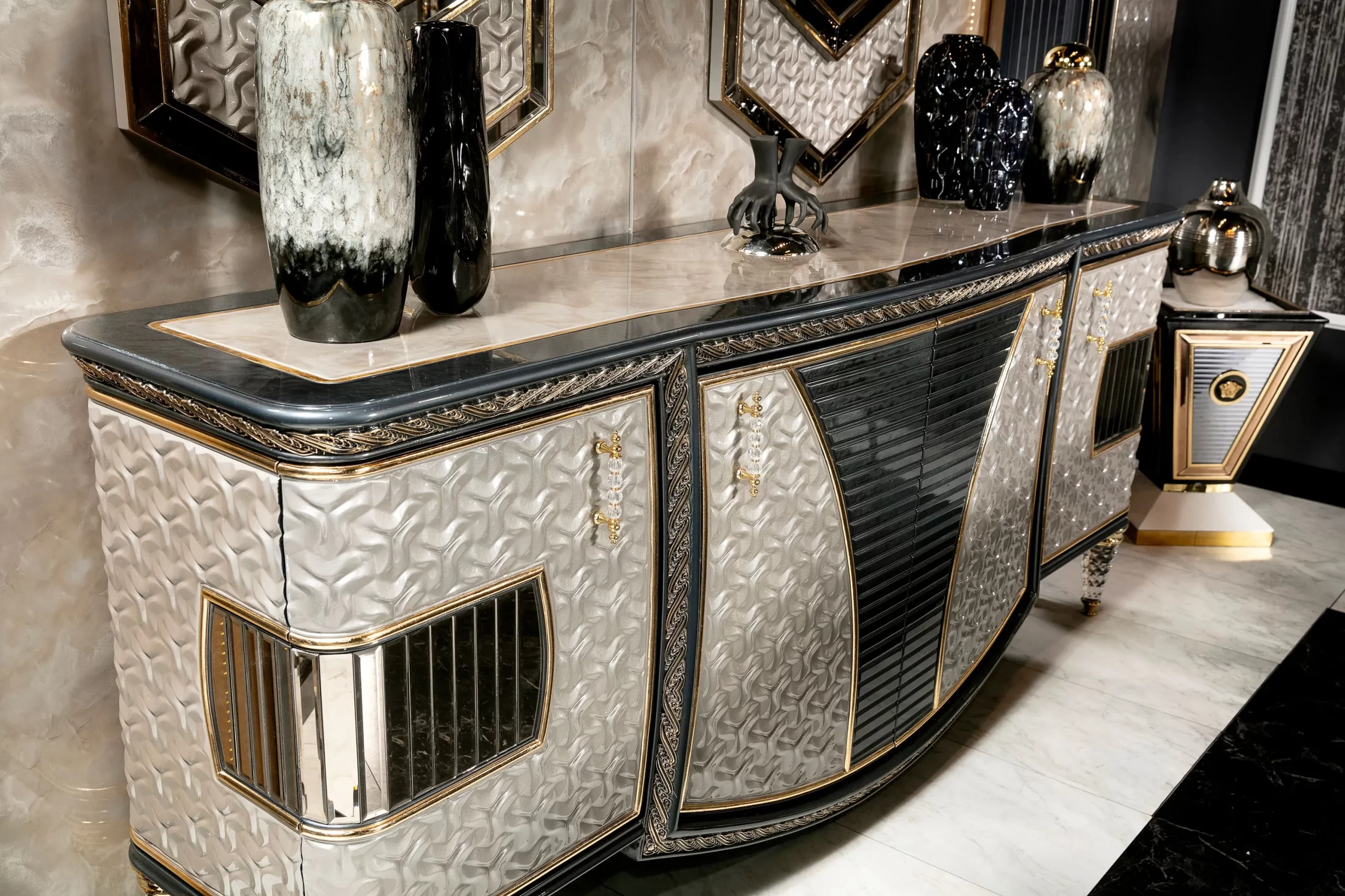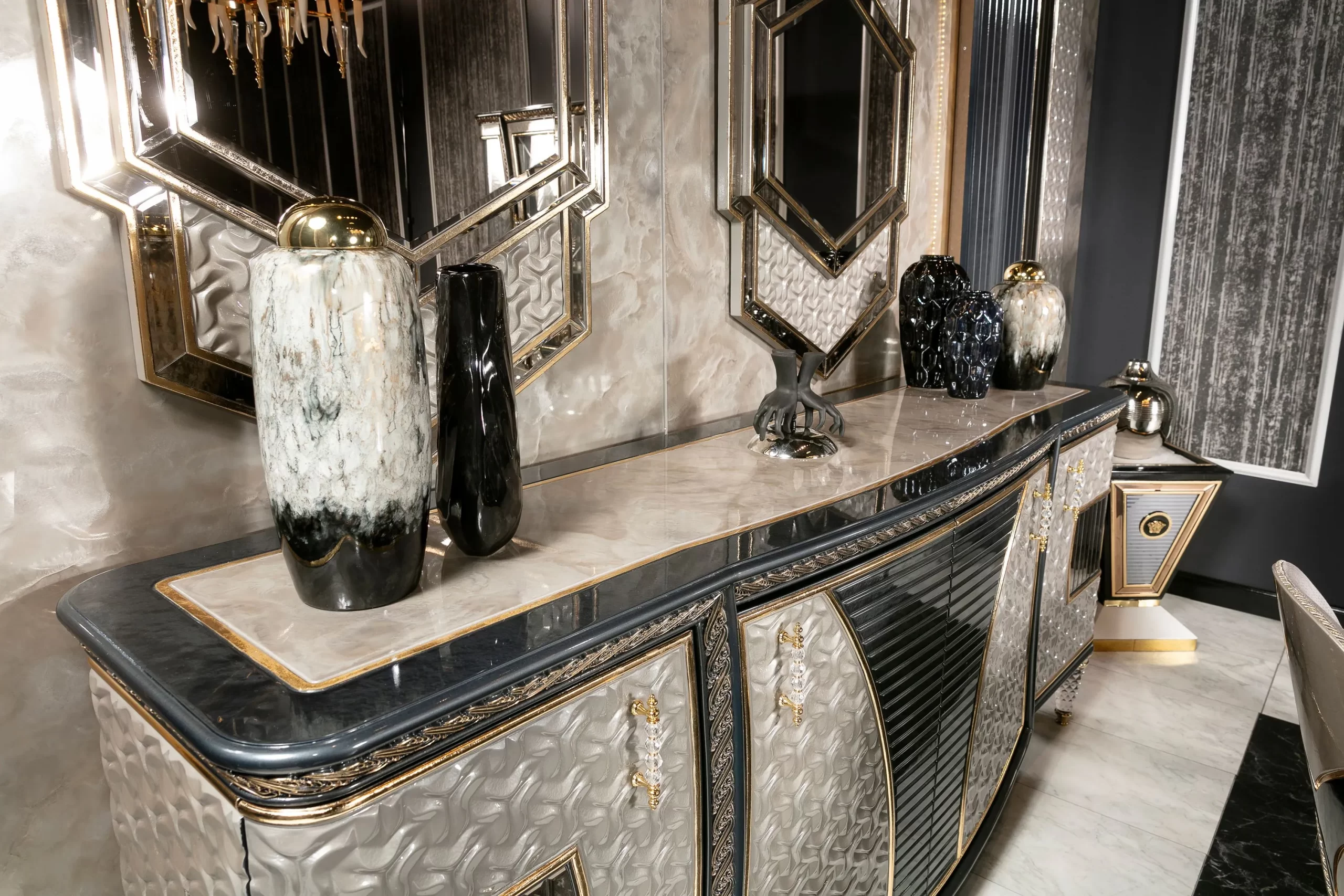 Geniş yemek masası, misafirlerinizi rahatlıkla ağırlayabileceğiniz geniş bir alan sunarken, ergonomik ve zarif sandalyeler konforlu bir oturma deneyimi sağlar. Takıma eşlik eden kristal detaylarla süslenmiş konsol ve vitrin, hem dekoratif hem de işlevsel çözümler sunar, eşyalarınızı şık bir şekilde sergileyebilmenize olanak tanır.
