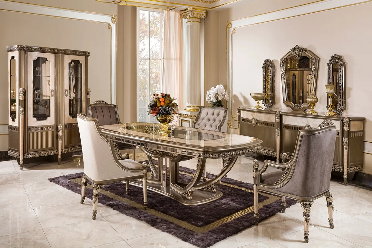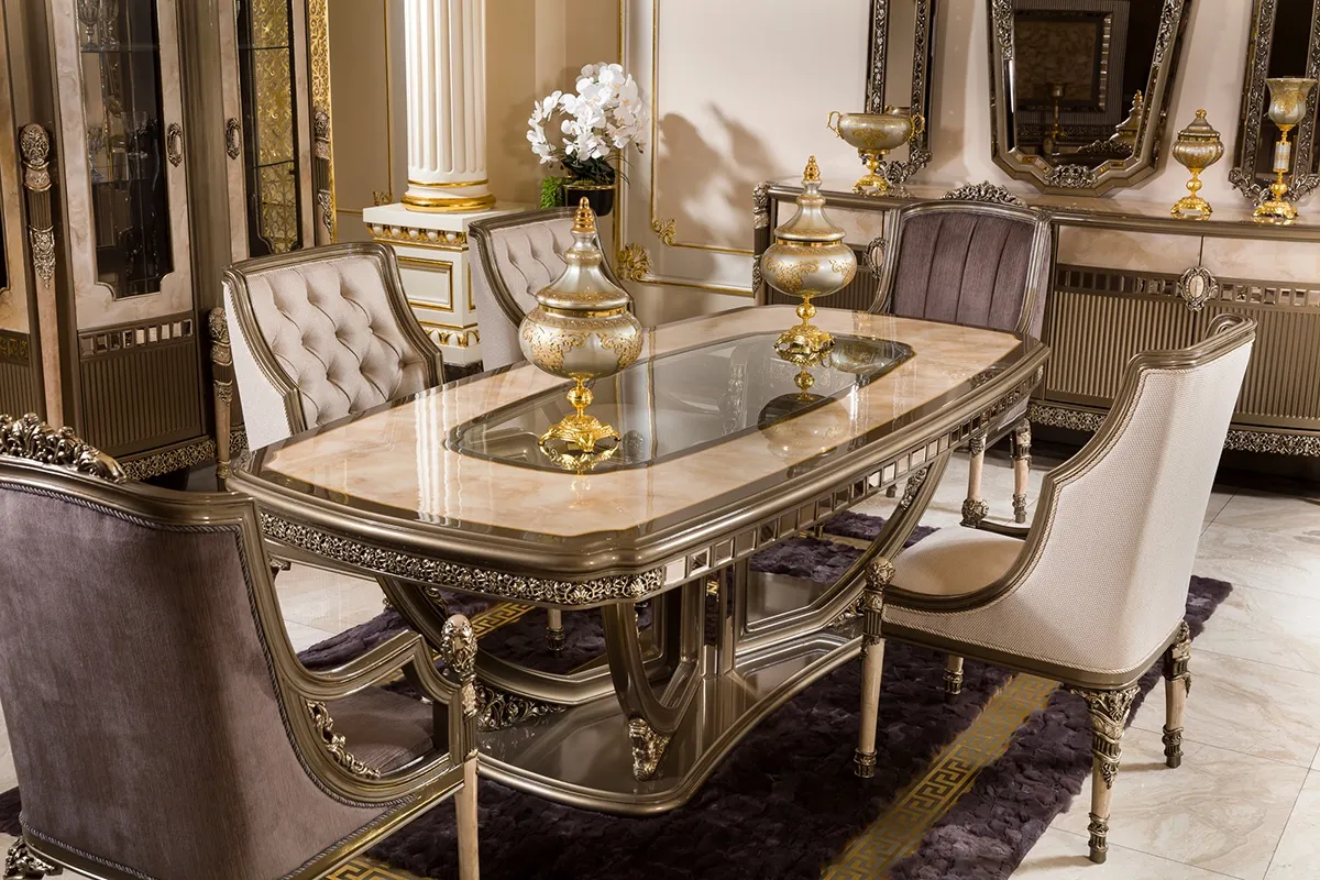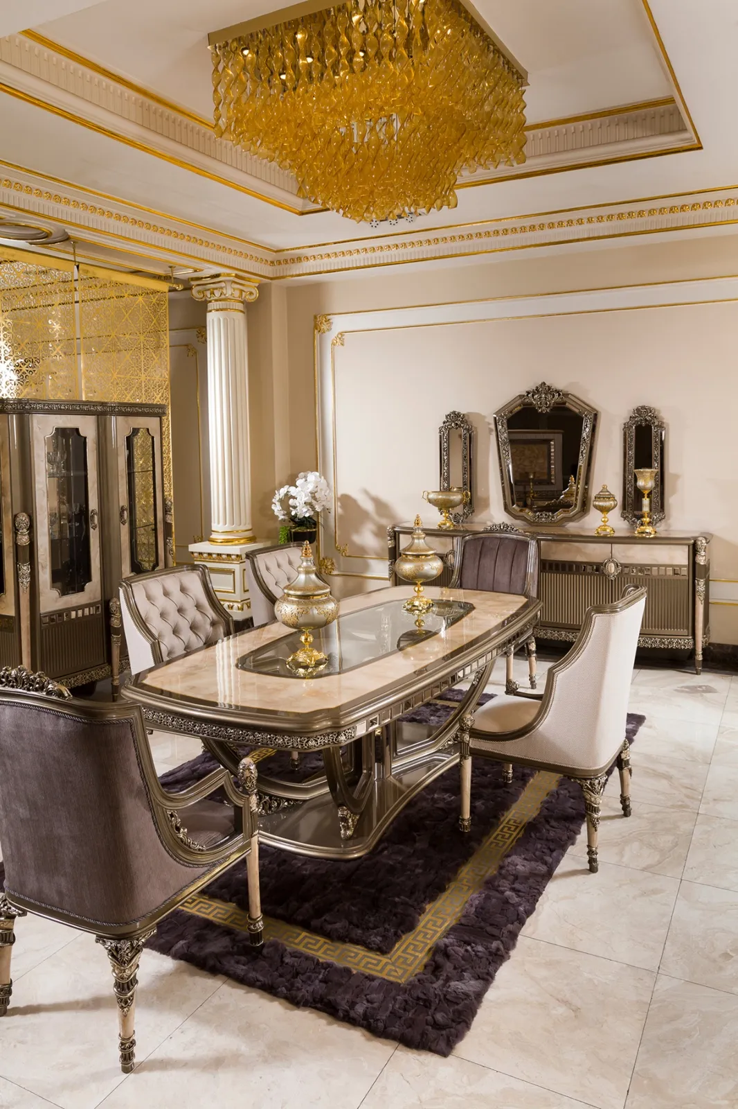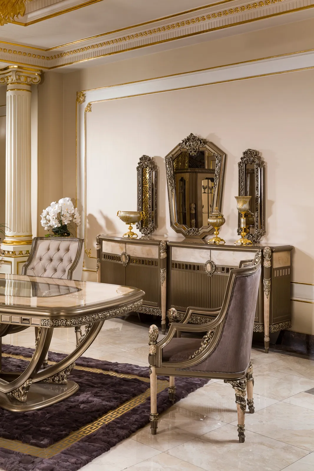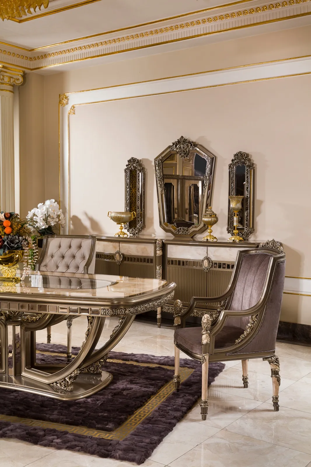Takımın geniş yemek masası, kalabalık sofralarda bile konforlu bir oturma alanı sunarken, ergonomik ve zarif sandalyeleri uzun oturumlarda bile rahatlık sağlar. İnce detaylarla süslenmiş konsol ve vitrin, hem dekoratif hem de işlevsel çözümler sunarak yemek odanızda düzeni ve estetiği bir arada sağlar.