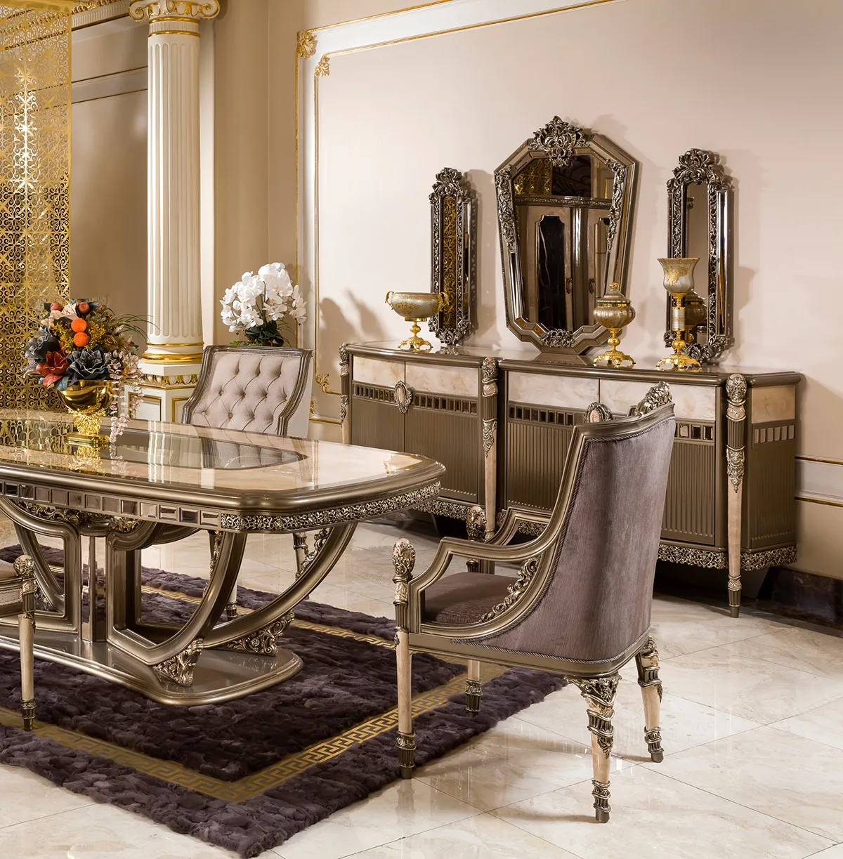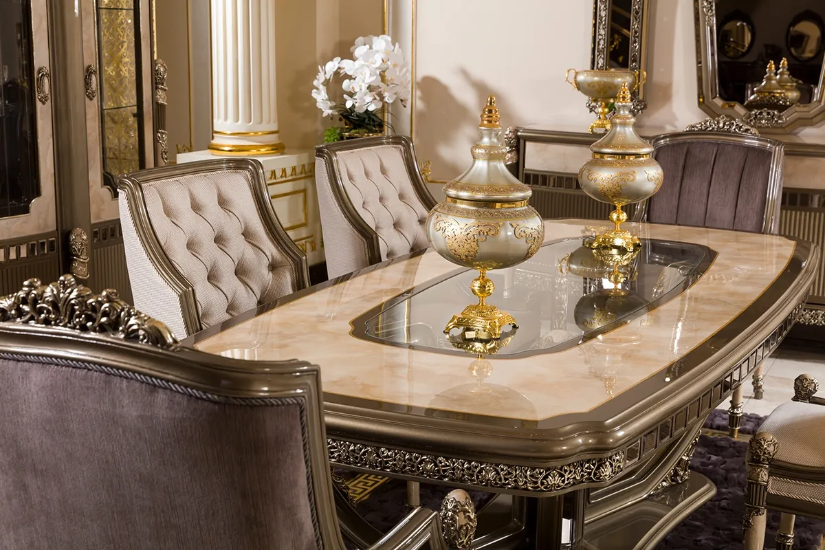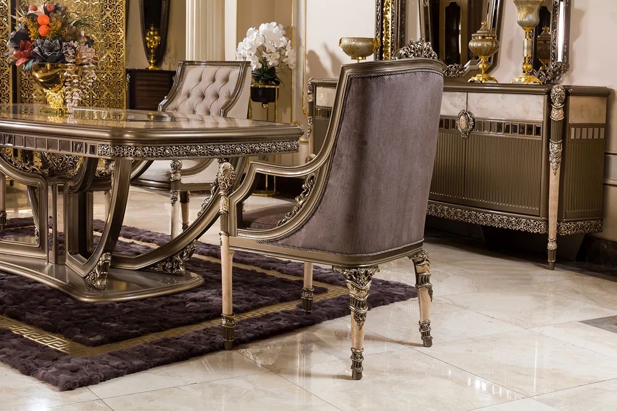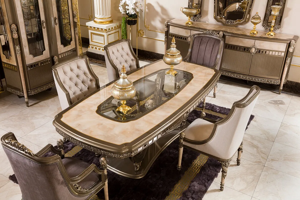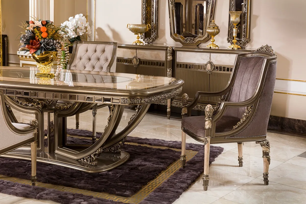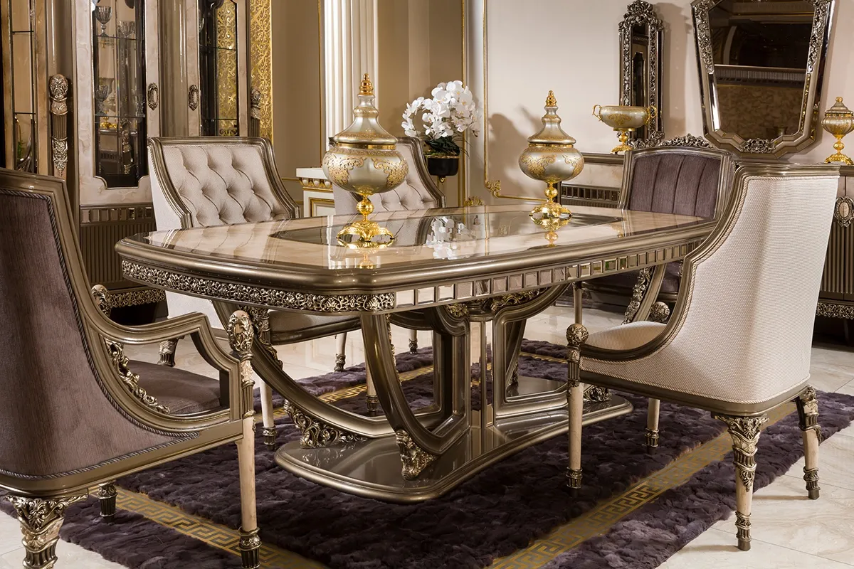 Takımın geniş yemek masası, kalabalık sofralarda bile konforlu bir oturma alanı sunarken, ergonomik ve zarif sandalyeleri uzun oturumlarda bile rahatlık sağlar. İnce detaylarla süslenmiş konsol ve vitrin, hem dekoratif hem de işlevsel çözümler sunarak yemek odanızda düzeni ve estetiği bir arada sağlar.
