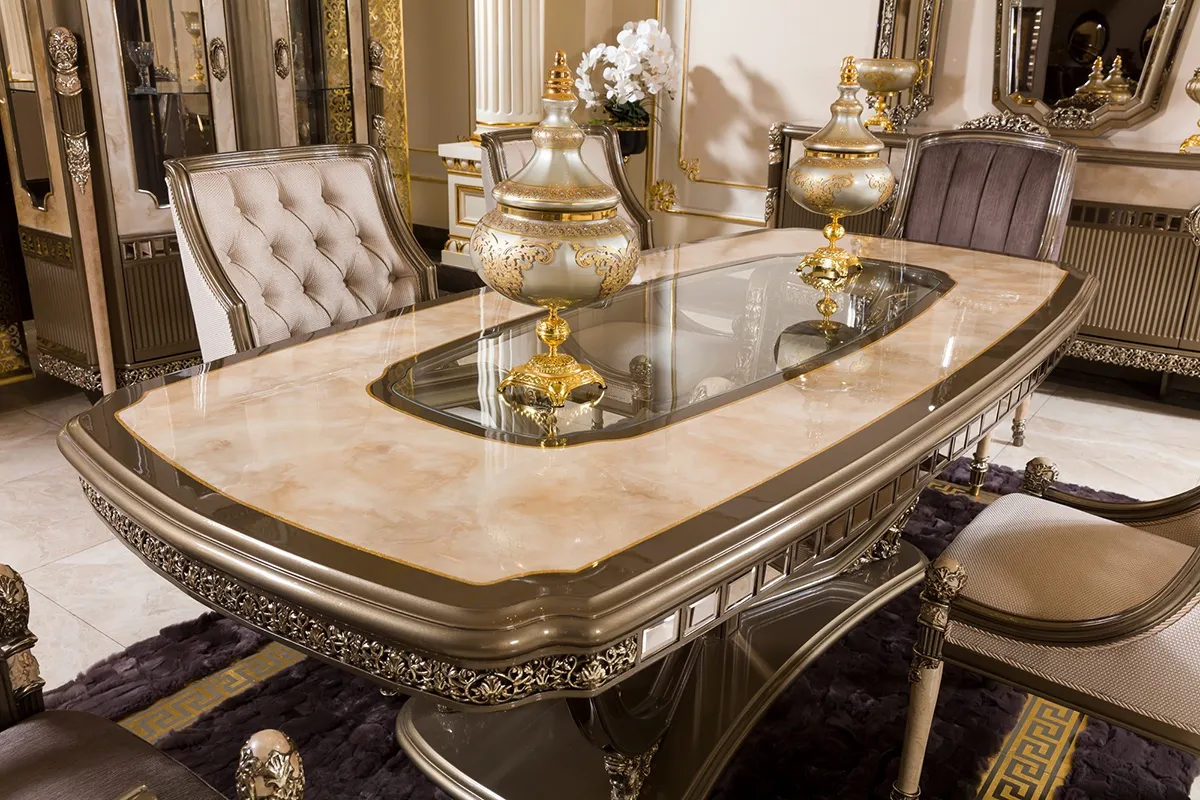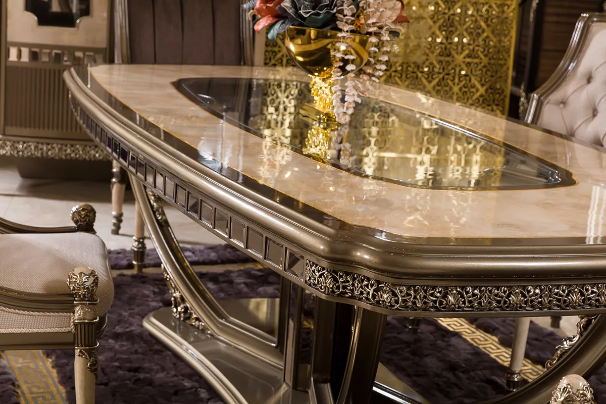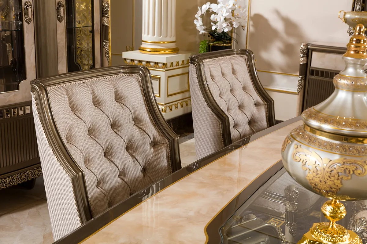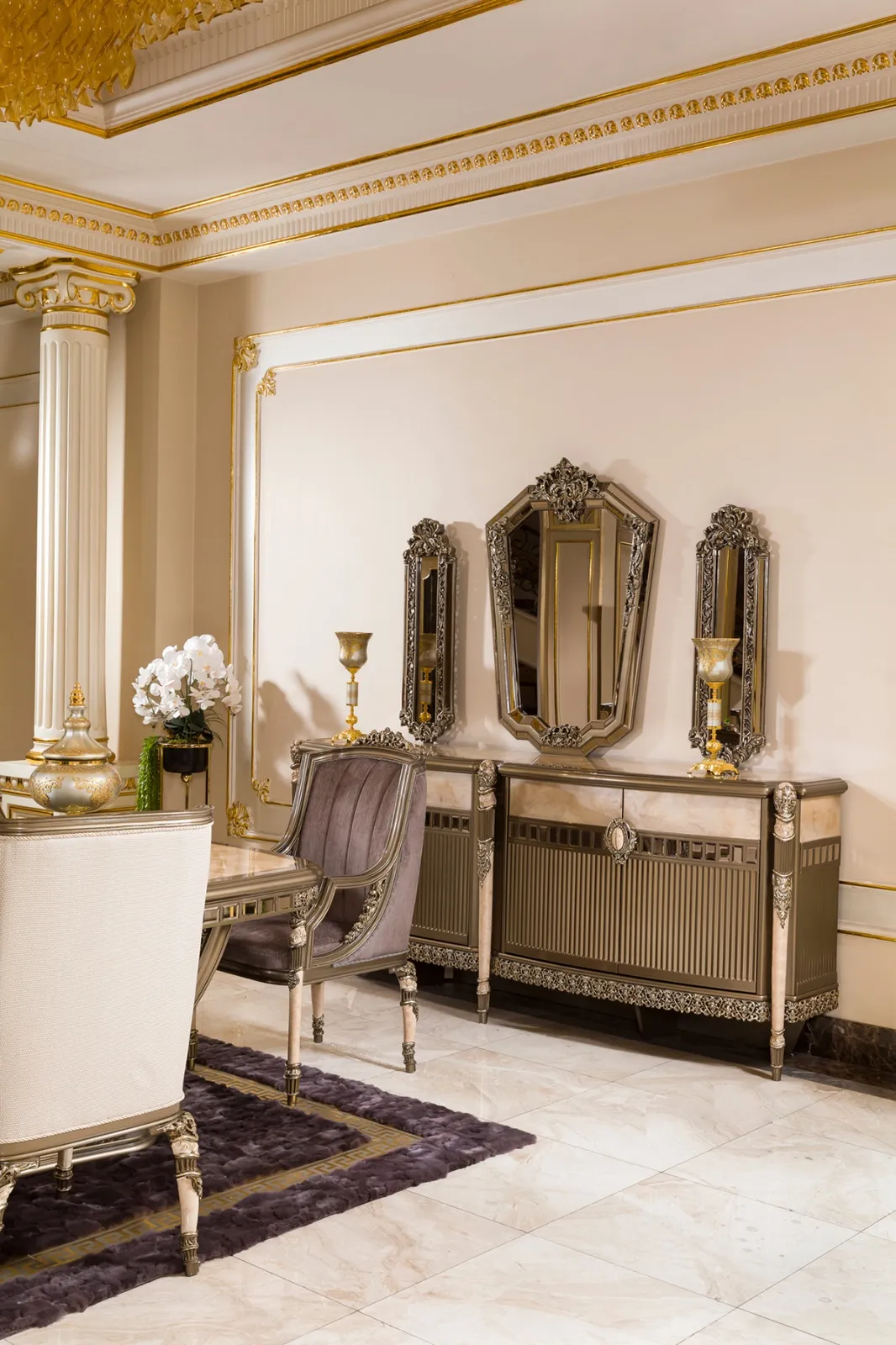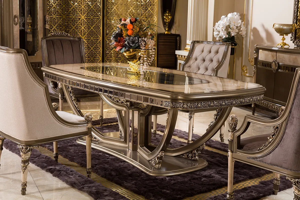 Takımın geniş yemek masası, kalabalık sofralarda bile konforlu bir oturma alanı sunarken, ergonomik ve zarif sandalyeleri uzun oturumlarda bile rahatlık sağlar. İnce detaylarla süslenmiş konsol ve vitrin, hem dekoratif hem de işlevsel çözümler sunarak yemek odanızda düzeni ve estetiği bir arada sağlar.