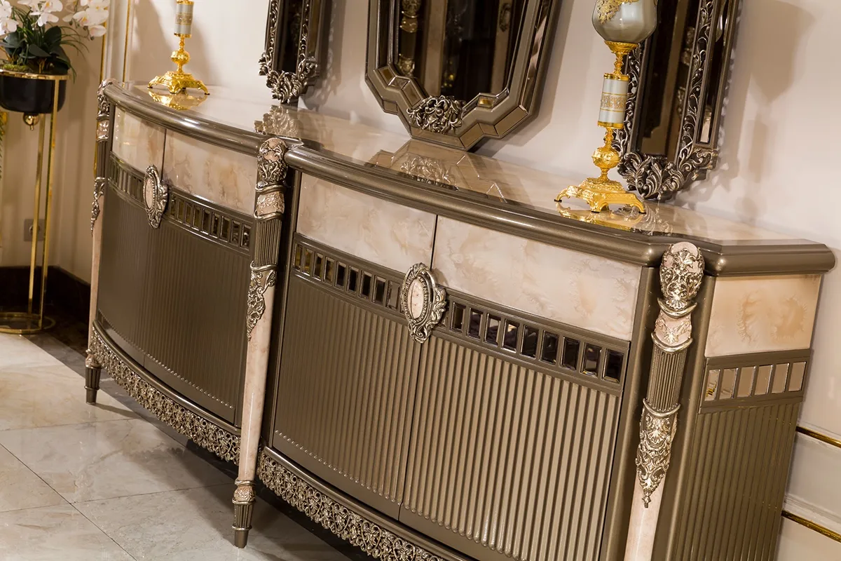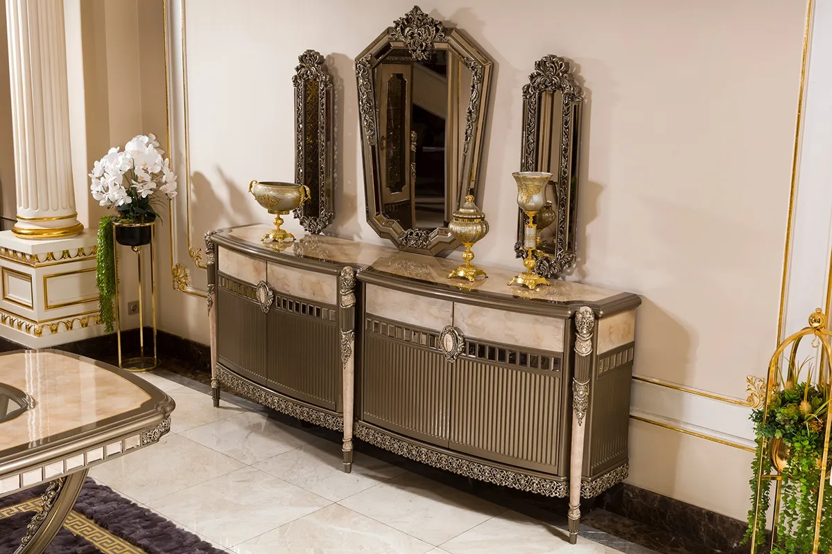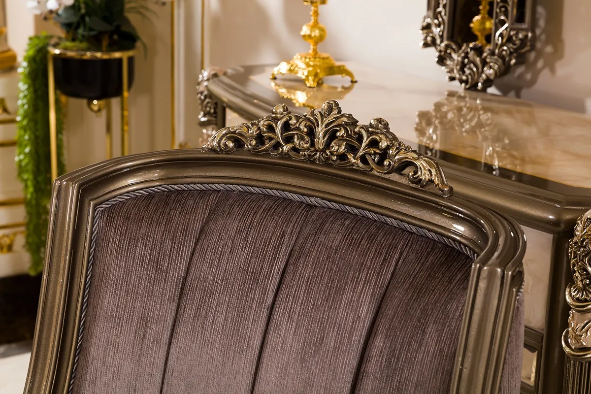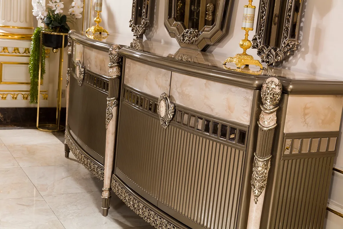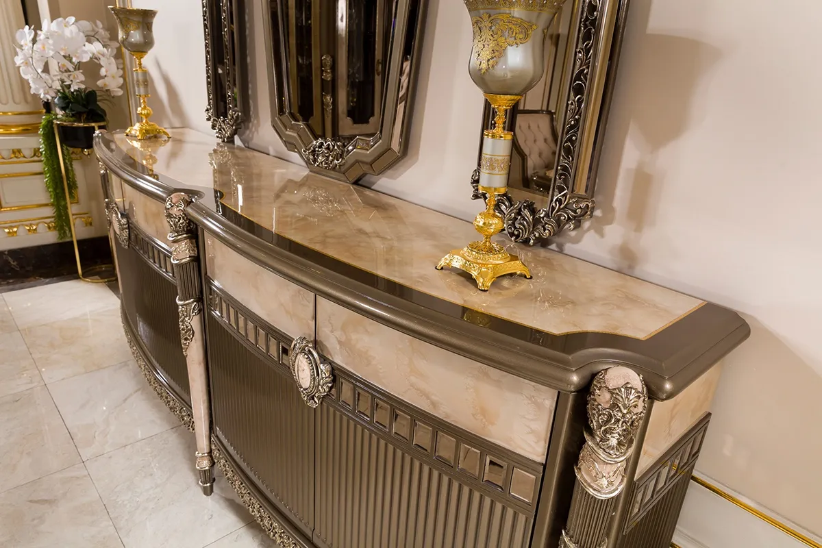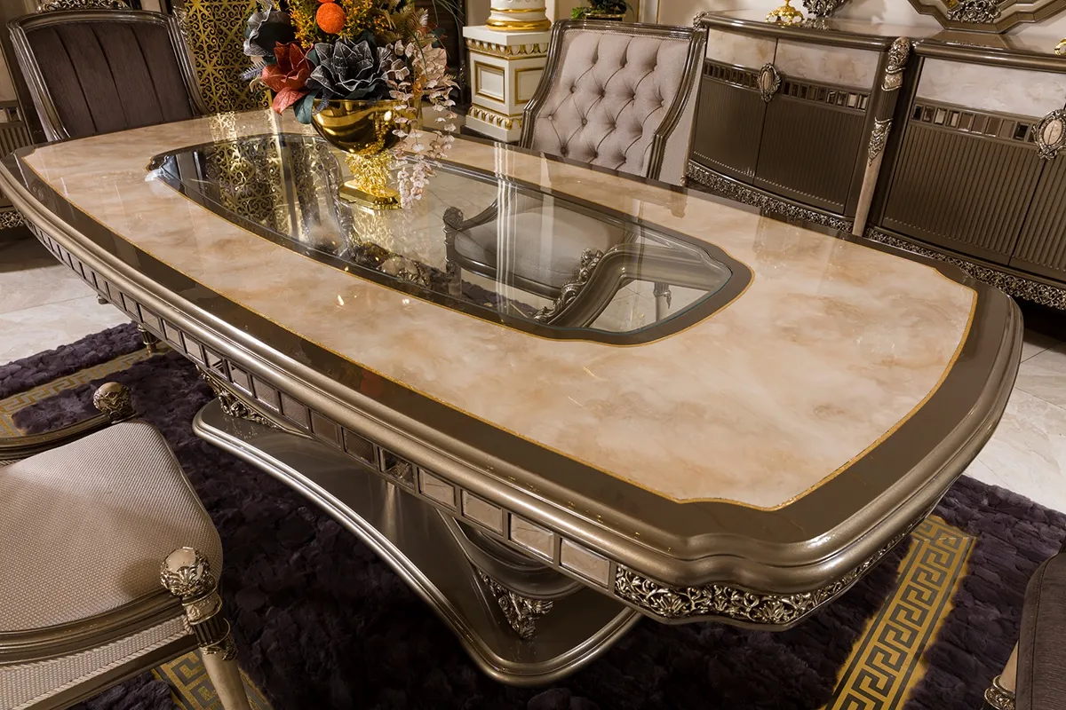 Takımın geniş yemek masası, kalabalık sofralarda bile konforlu bir oturma alanı sunarken, ergonomik ve zarif sandalyeleri uzun oturumlarda bile rahatlık sağlar. İnce detaylarla süslenmiş konsol ve vitrin, hem dekoratif hem de işlevsel çözümler sunarak yemek odanızda düzeni ve estetiği bir arada sağlar.