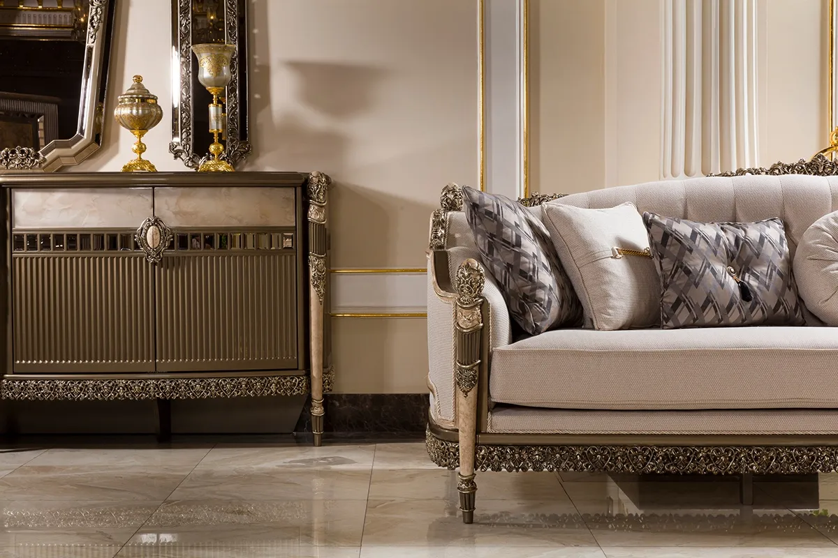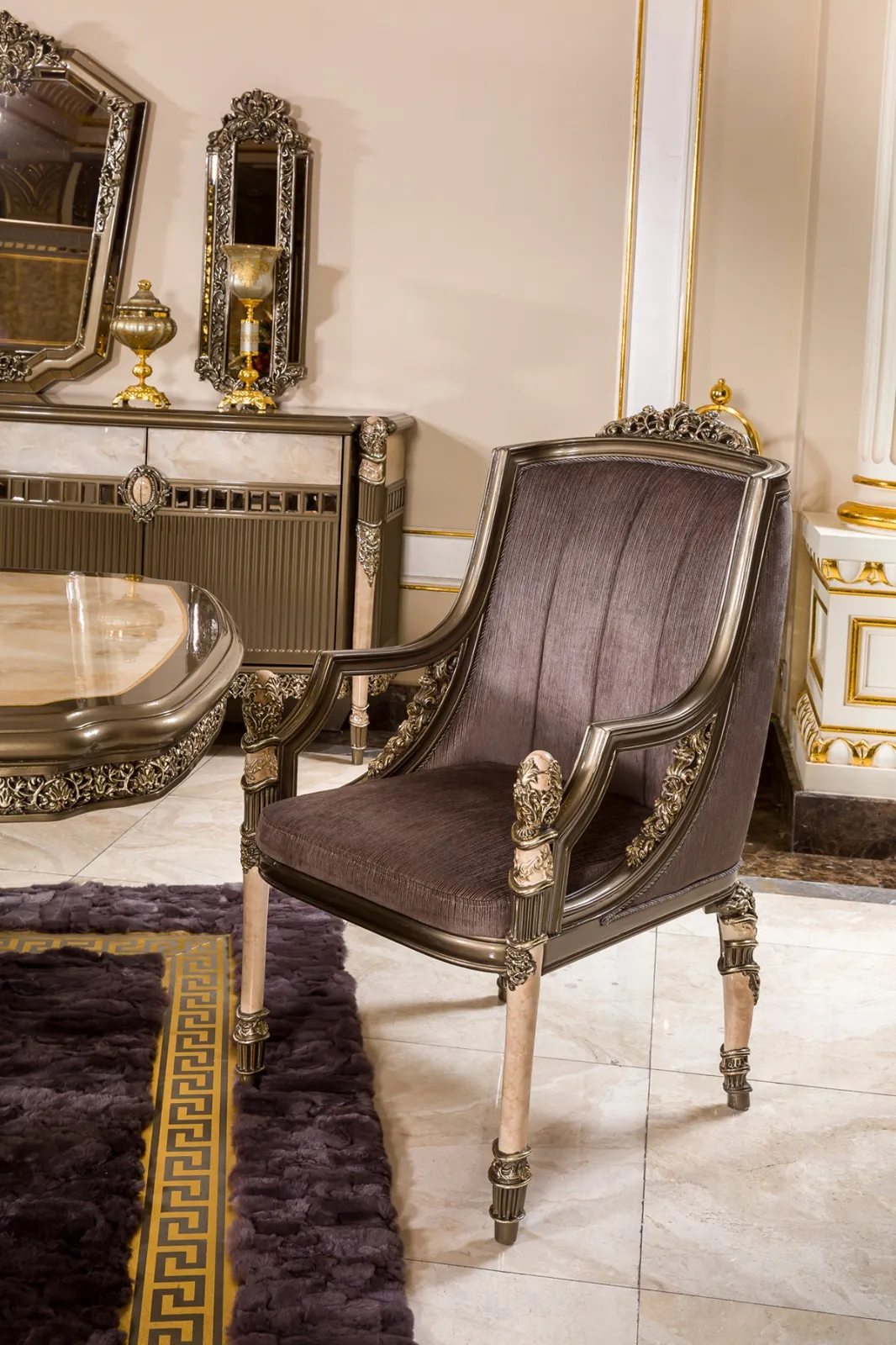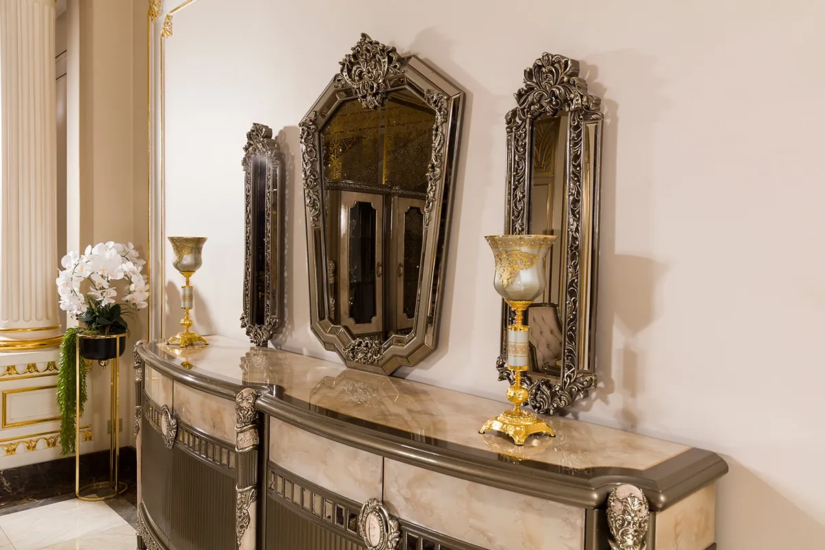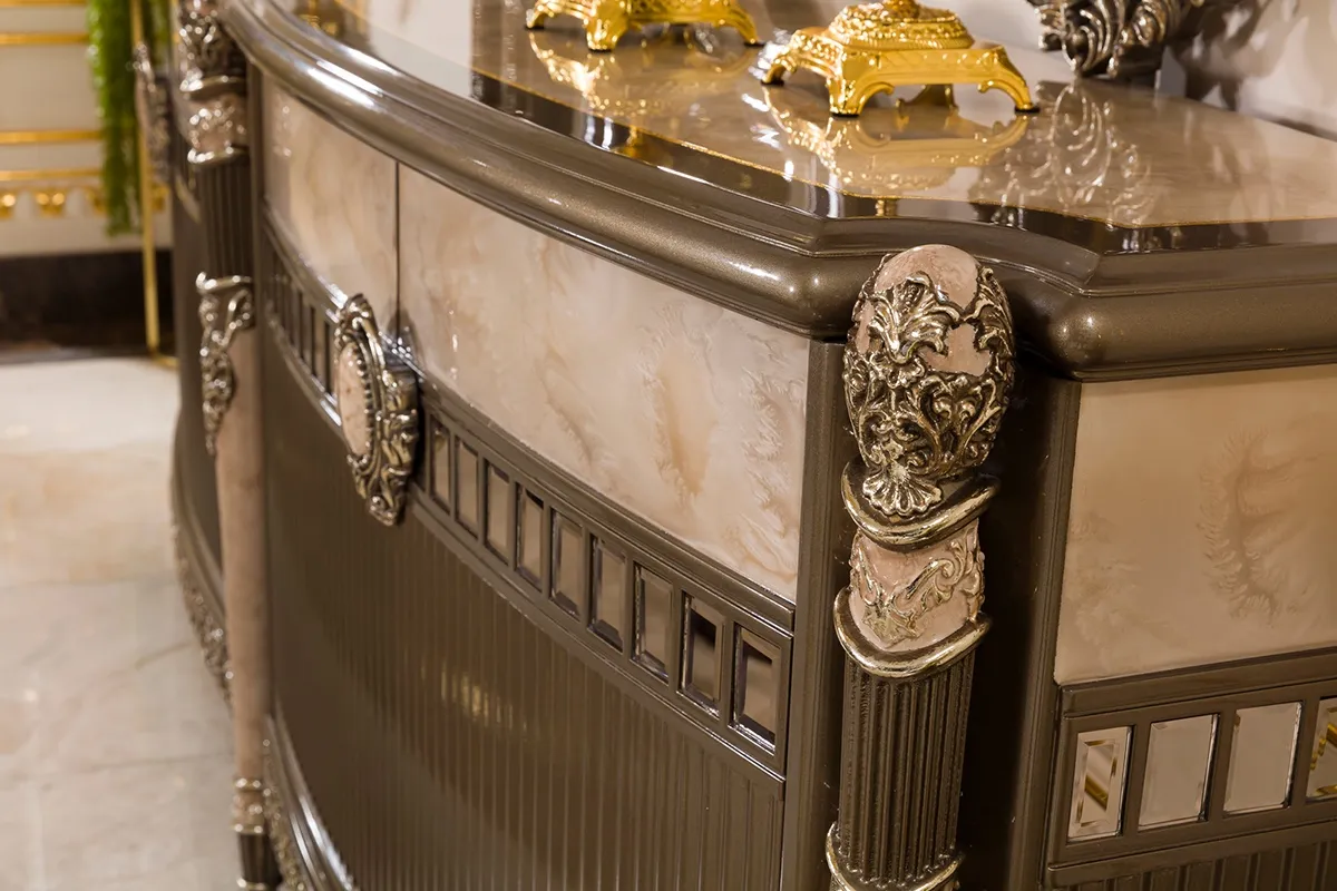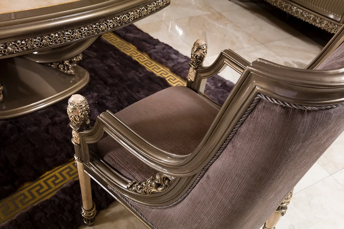 Takımın geniş yemek masası, kalabalık sofralarda bile konforlu bir oturma alanı sunarken, ergonomik ve zarif sandalyeleri uzun oturumlarda bile rahatlık sağlar. İnce detaylarla süslenmiş konsol ve vitrin, hem dekoratif hem de işlevsel çözümler sunarak yemek odanızda düzeni ve estetiği bir arada sağlar.