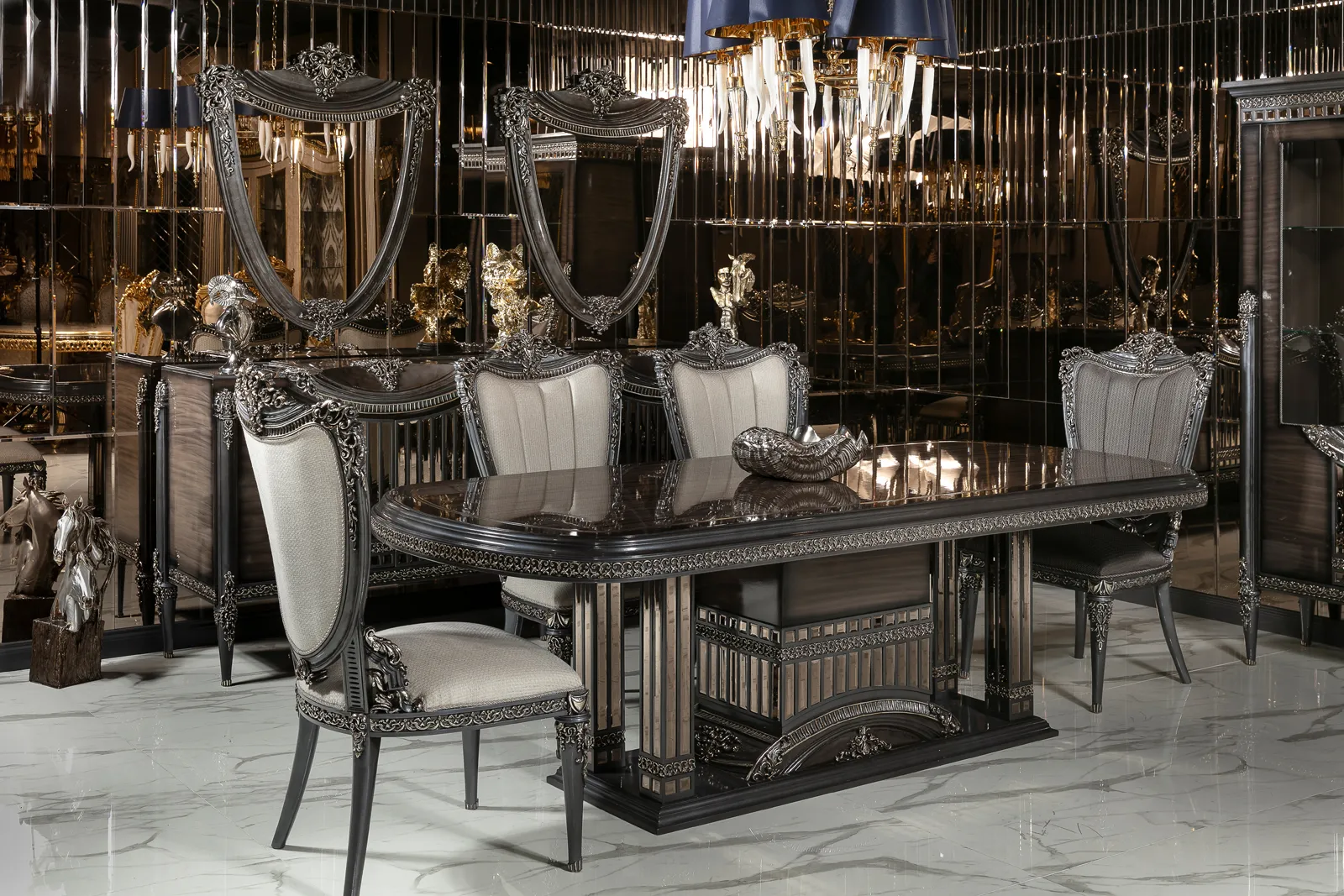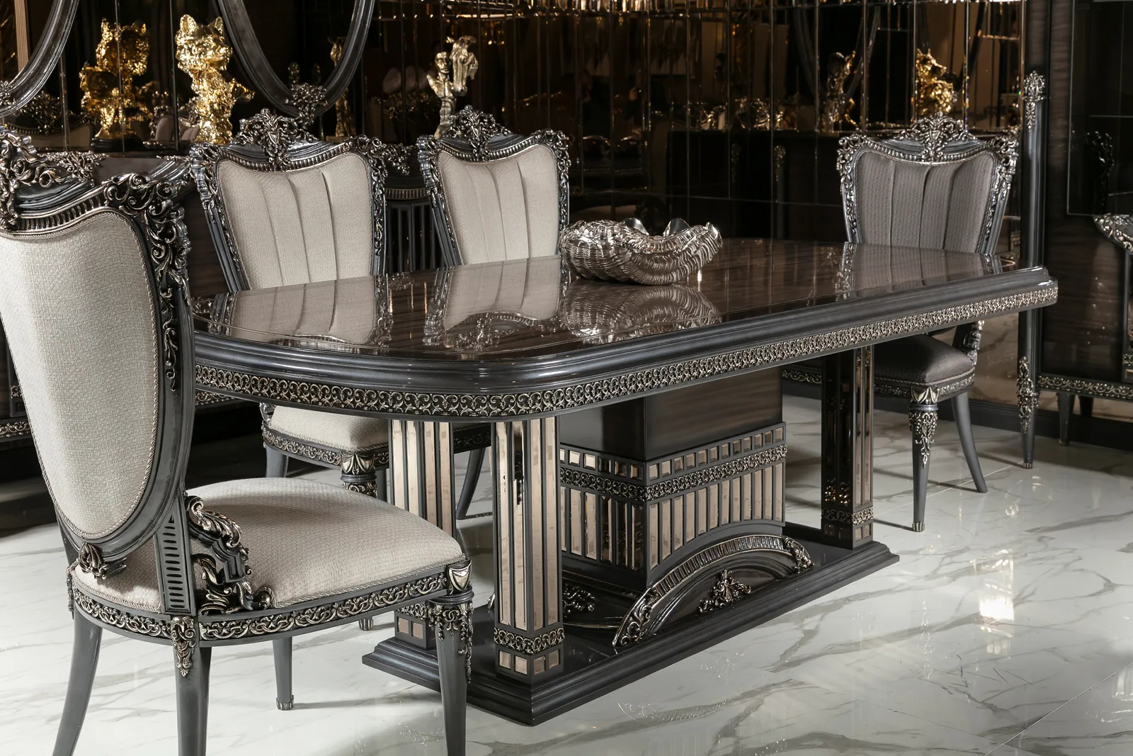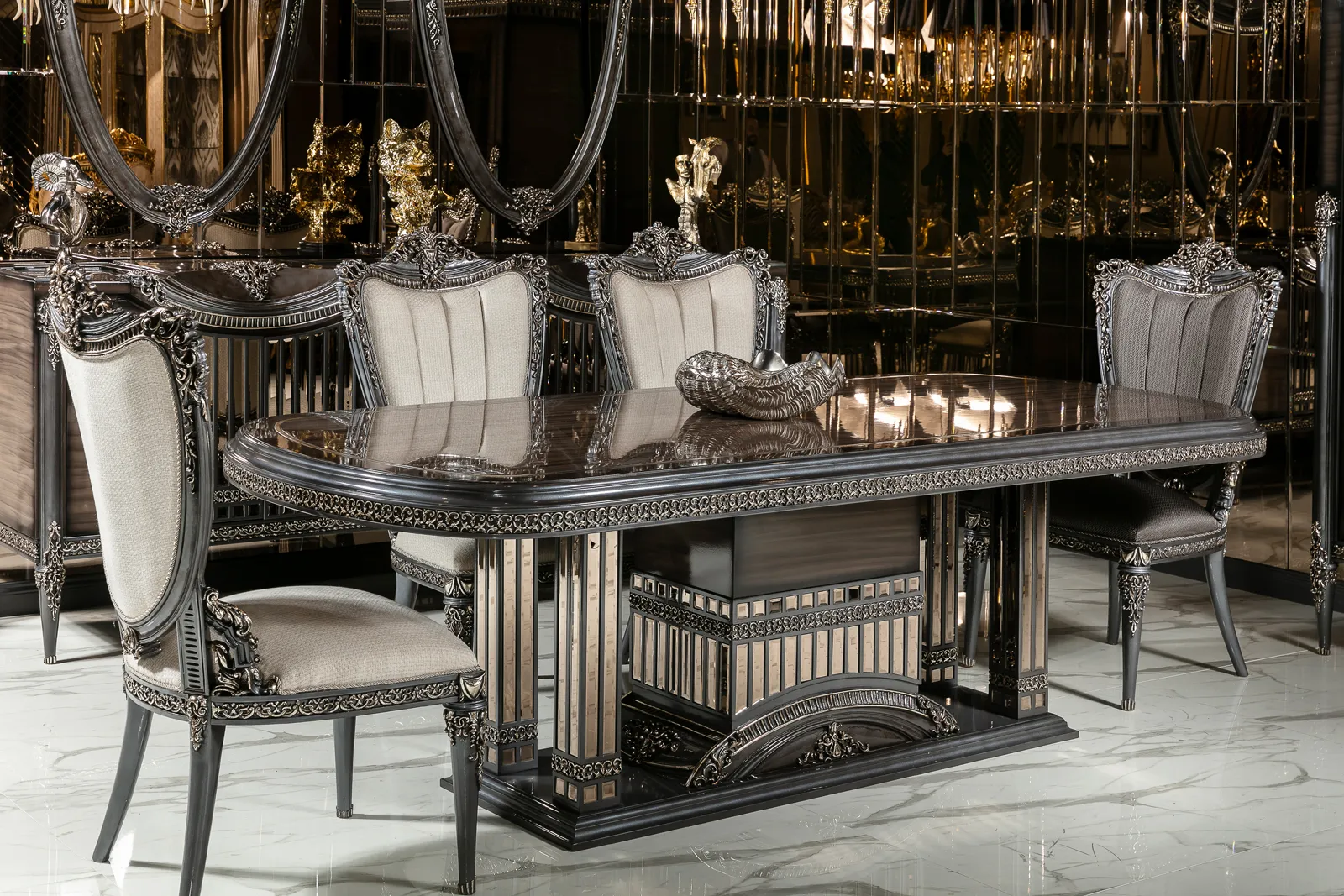 Takımın zarif ve ergonomik sandalyeleri, hem şıklığı hem de konforu bir arada sunarak misafirlerinizi en iyi şekilde ağırlamanızı sağlar. Konsol ve vitrin gibi tamamlayıcı parçalar, yemek odanızda düzen ve estetik bir bütünlük oluşturur. Bu parçalar, eşyalarınızı şık bir şekilde sergilemenizi sağlarken yemek odanıza lüks bir dokunuş katar.