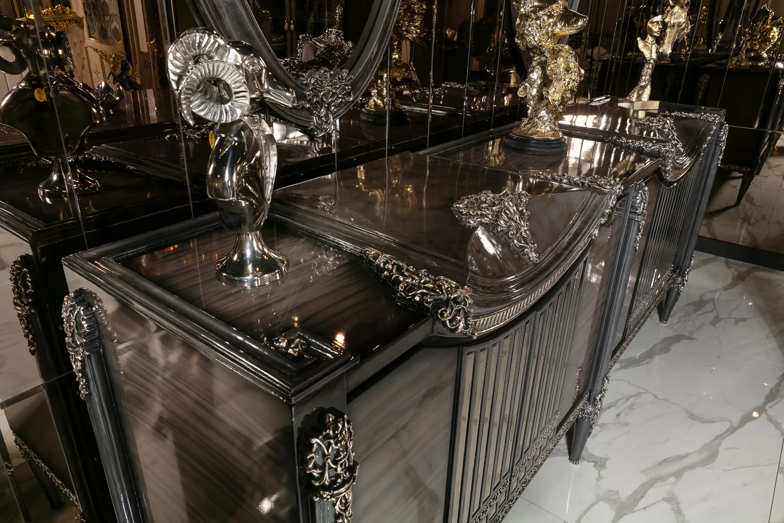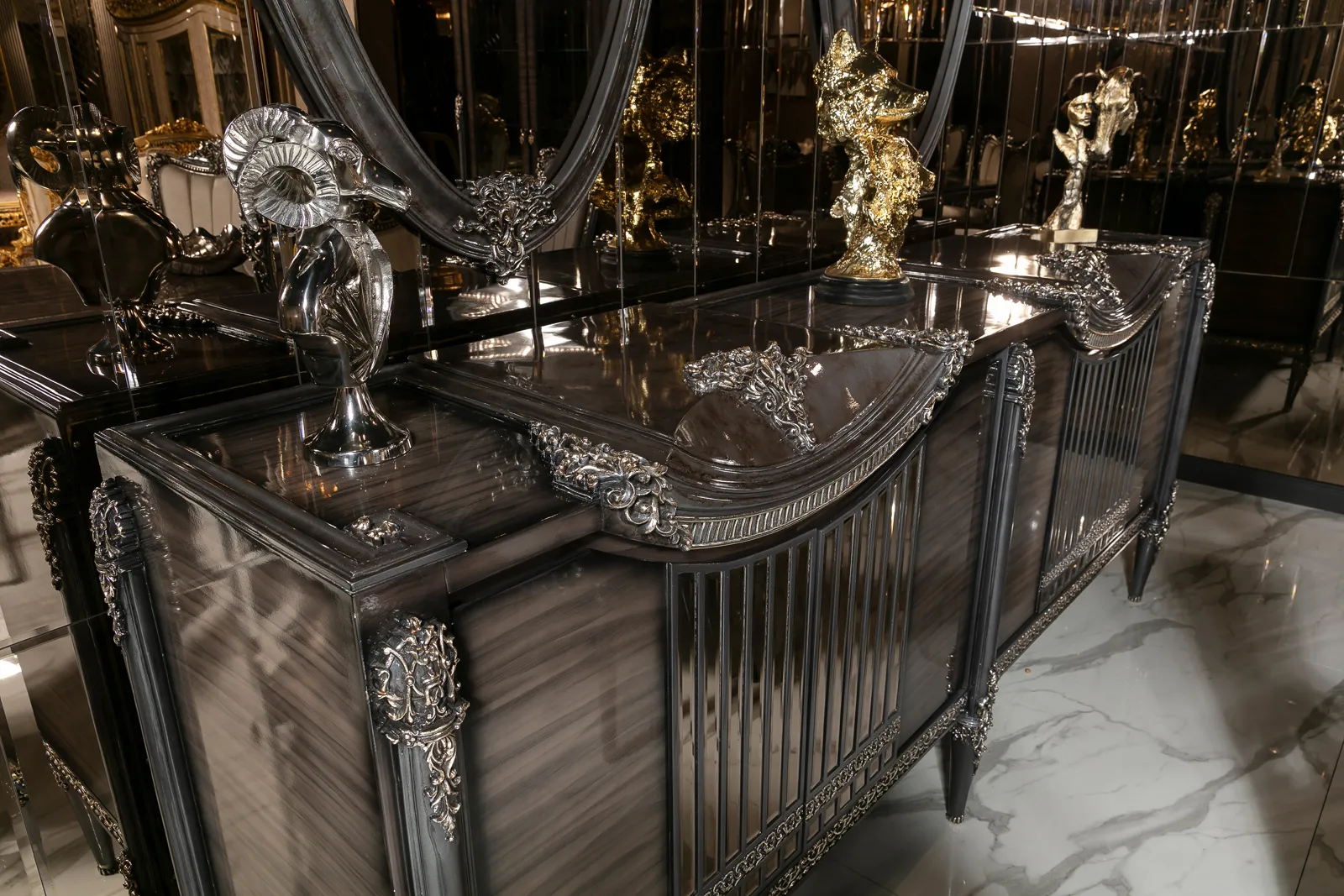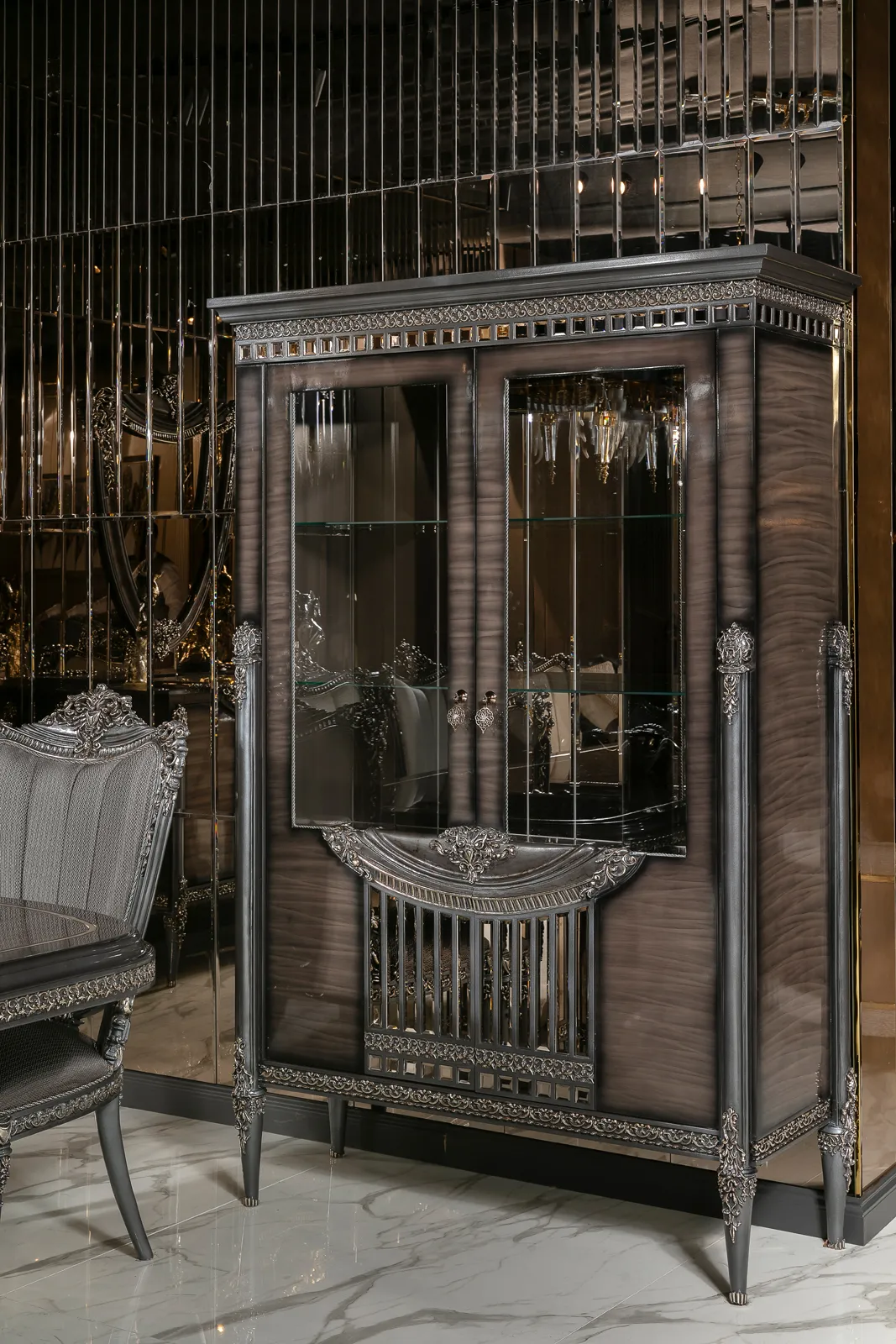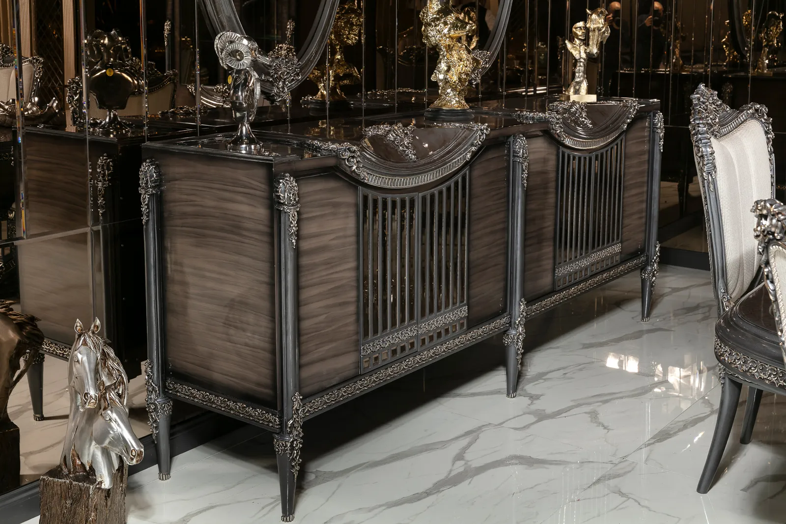 Takımın zarif ve ergonomik sandalyeleri, hem şıklığı hem de konforu bir arada sunarak misafirlerinizi en iyi şekilde ağırlamanızı sağlar. Konsol ve vitrin gibi tamamlayıcı parçalar, yemek odanızda düzen ve estetik bir bütünlük oluşturur. Bu parçalar, eşyalarınızı şık bir şekilde sergilemenizi sağlarken yemek odanıza lüks bir dokunuş katar.