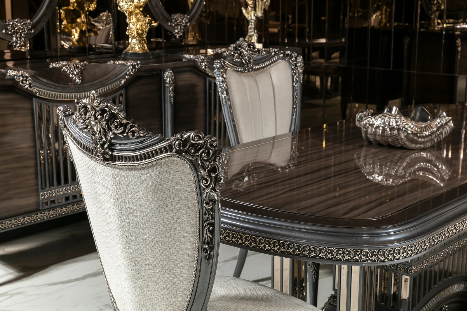 Queen Yemek Odası Takımı, klasik ve modern detayların kusursuz bir uyum içinde buluştuğu zarif bir tasarıma sahip. Eğer evinizde sofistike, lüks ve zamansız bir yemek odası dekoru arıyorsanız, Queen Yemek Odası Takımı tam size göre!