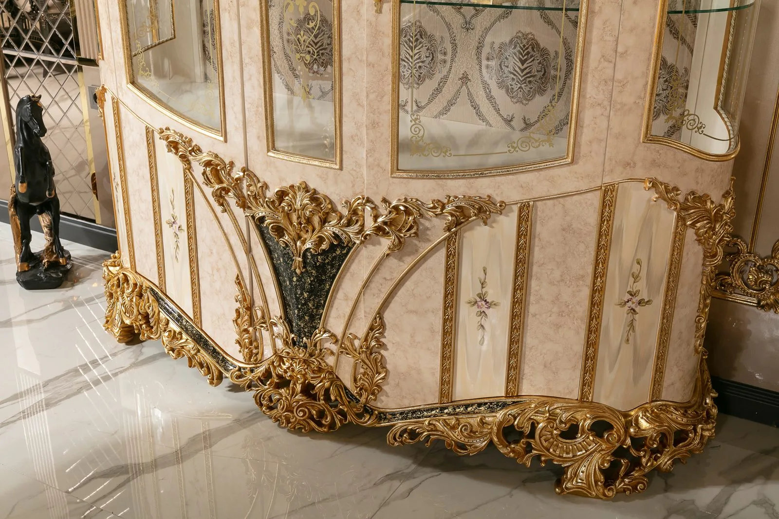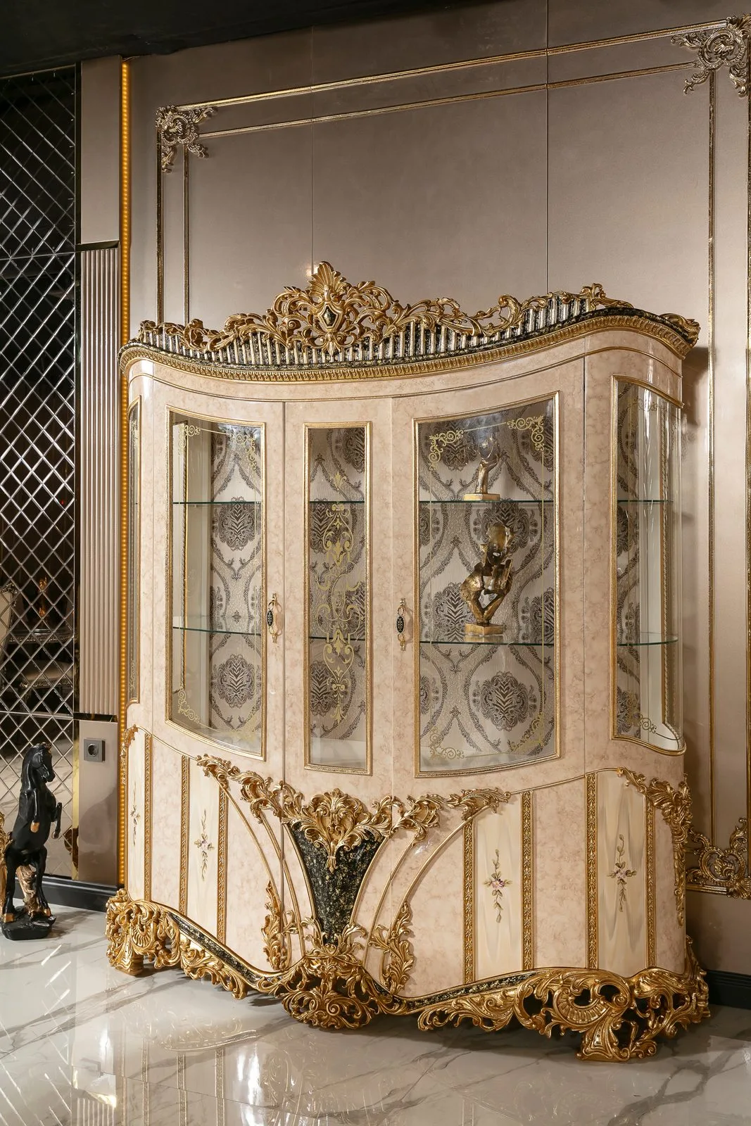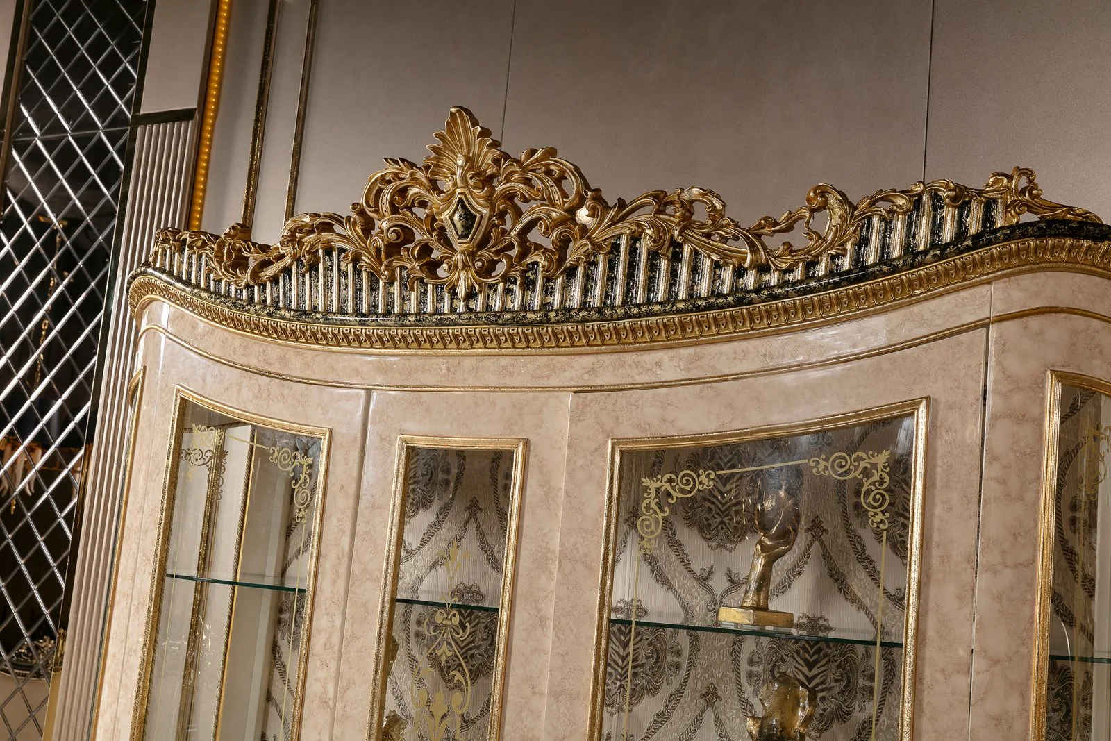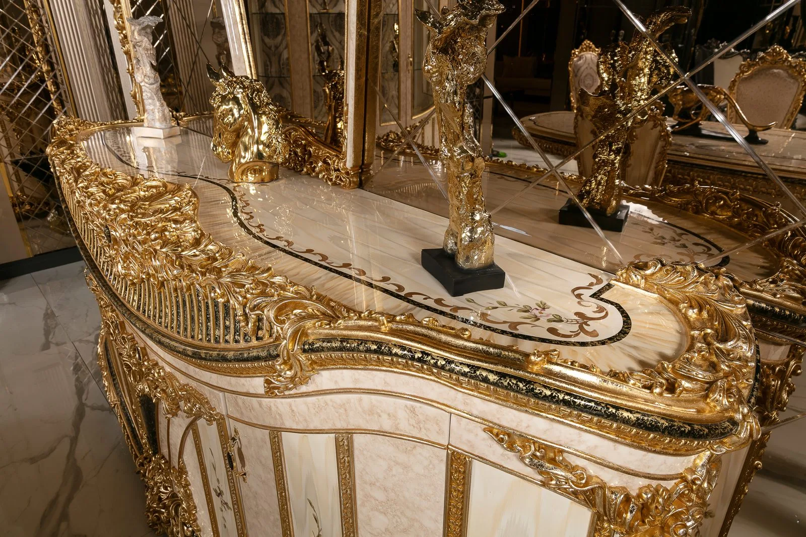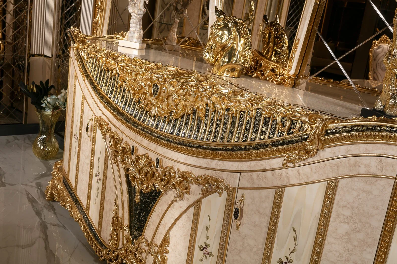 Takımın zarif ve ergonomik sandalyeleri, sadece şıklığıyla değil, aynı zamanda sunduğu konforla da fark yaratır. Konsol ve vitrin gibi tamamlayıcı parçalar, yemek odanızda hem düzeni sağlar hem de estetik bir görüntü oluşturur. Royal Yemek Odası Takımı, sofralarınıza zamansız bir şıklık katarken, her detayıyla göz alıcı bir atmosfer yaratır.
