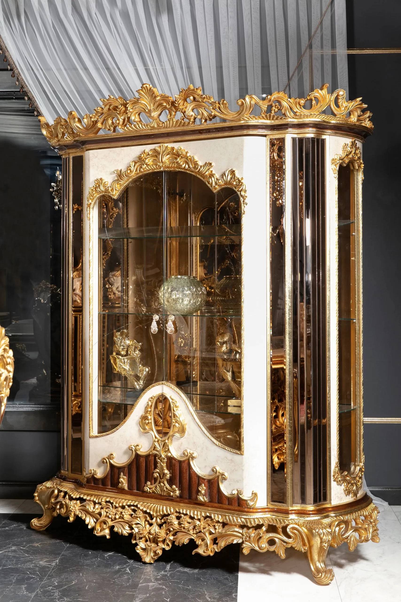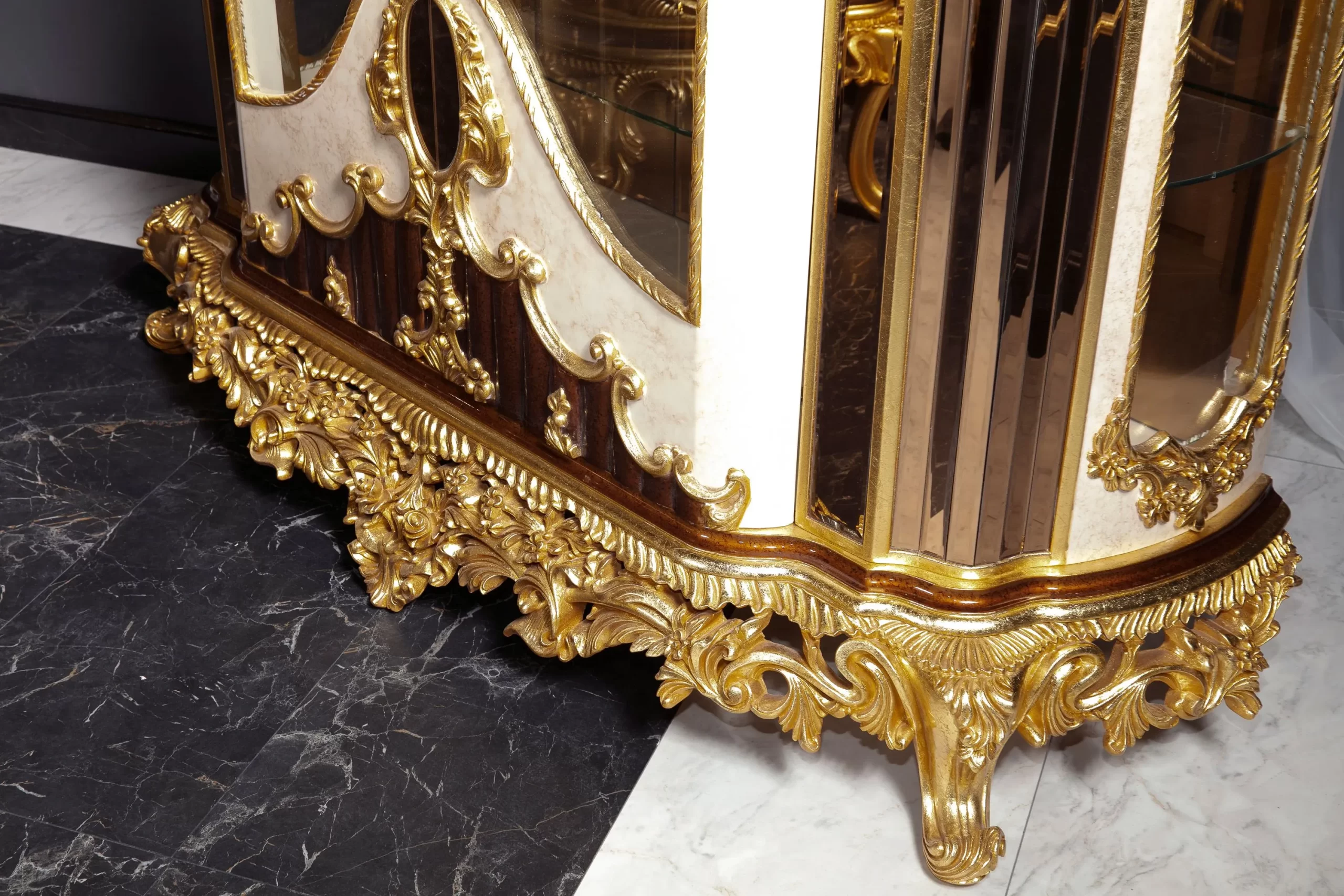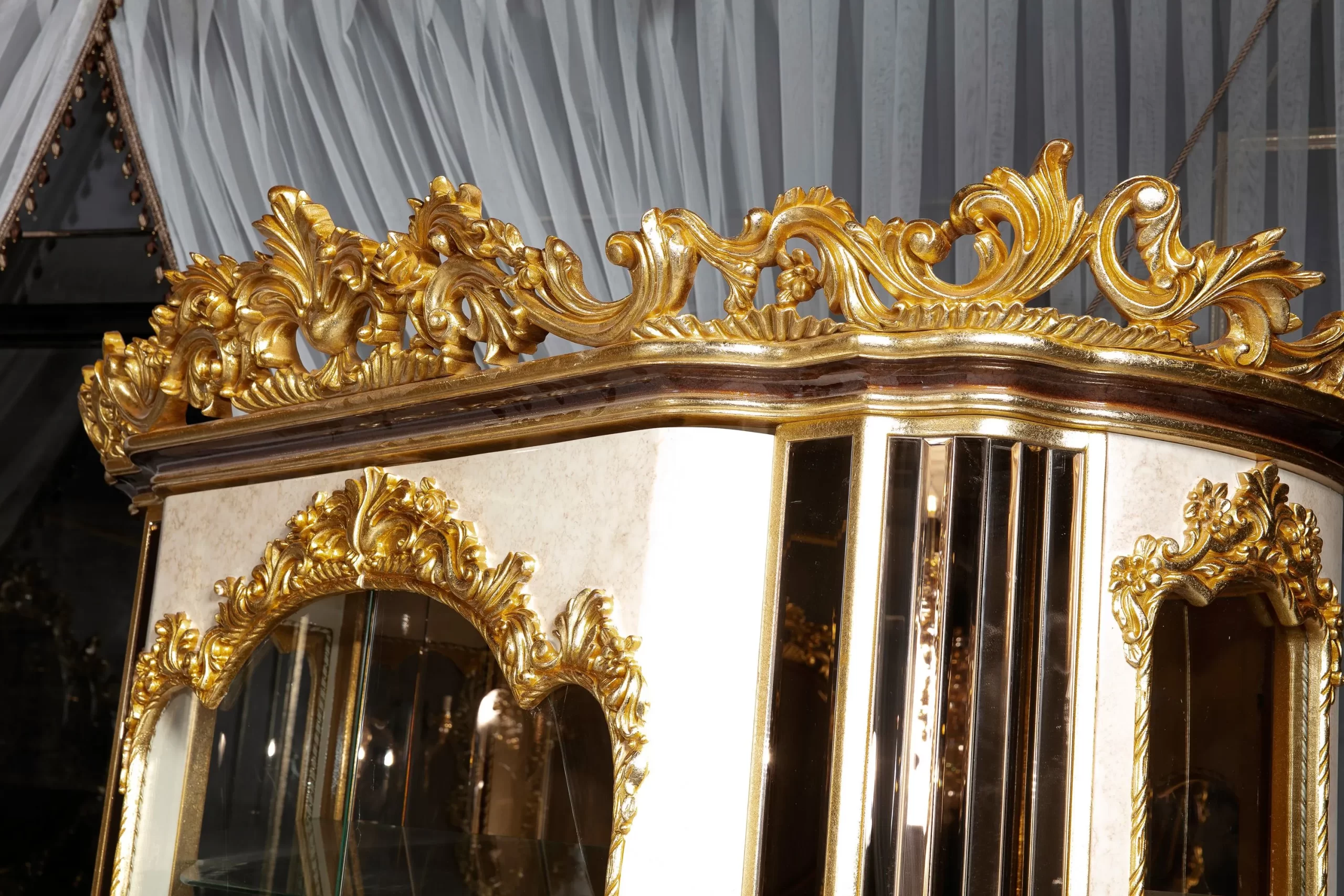 Takımın konforlu sandalyeleri, uzun süreli oturumlarda bile rahatlık sağlar. Zarif konsol ve vitrin, yemek odanızda düzeni sağlarken, dekoratif bir estetik yaratır. Şehzade Yemek Odası Takımı’nın detaylı işçiliği, her parçasında geleneksel zarafeti hissettirirken, lüks bir atmosfer oluşturur.