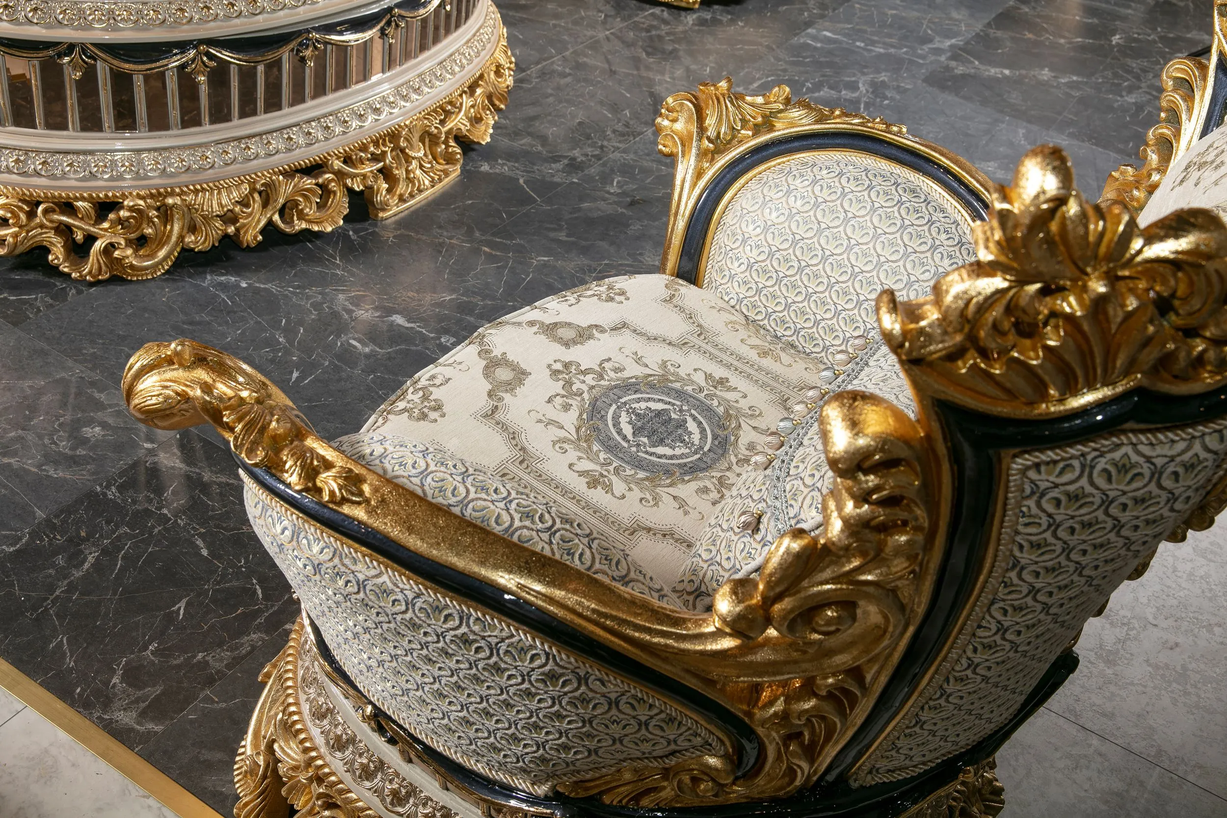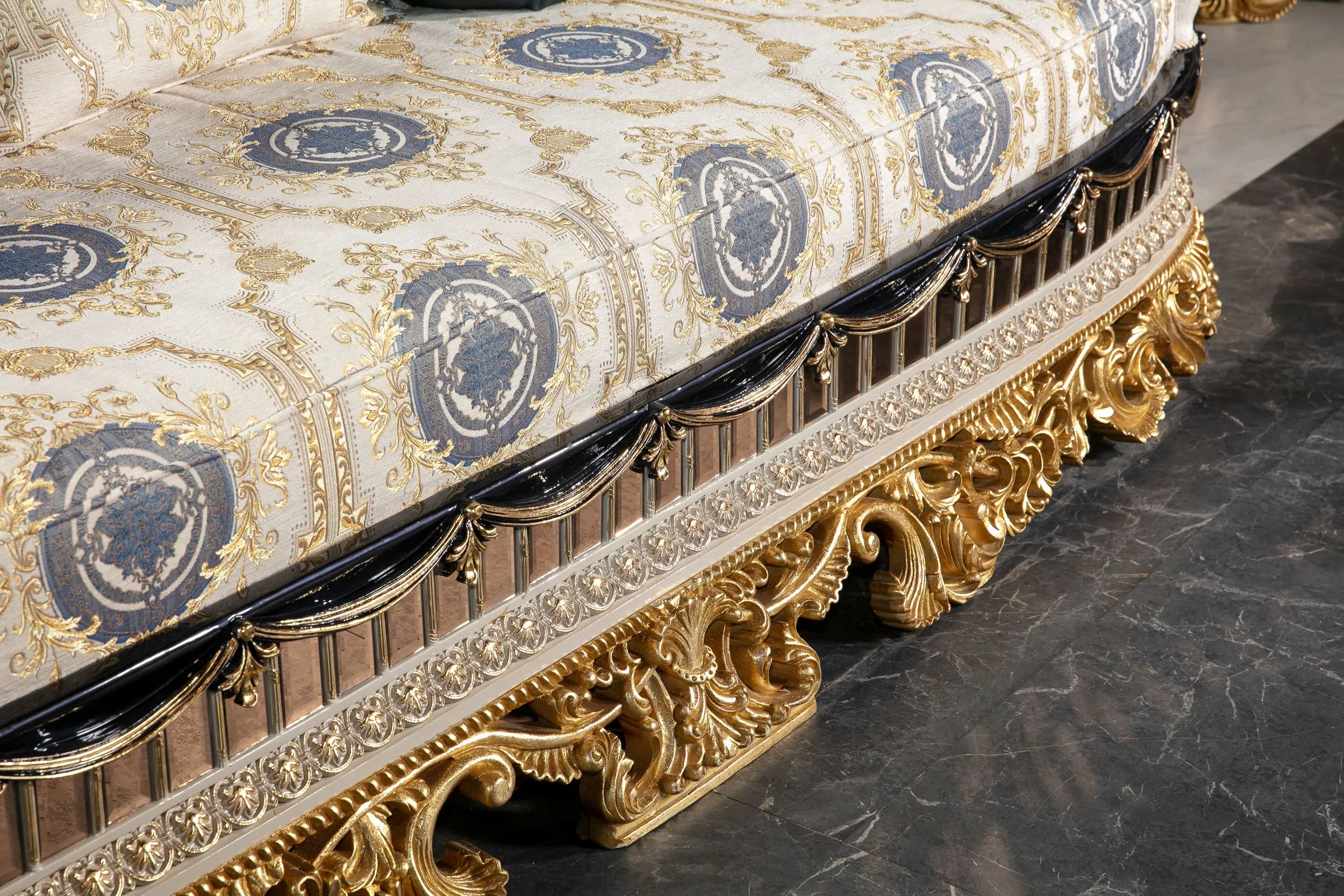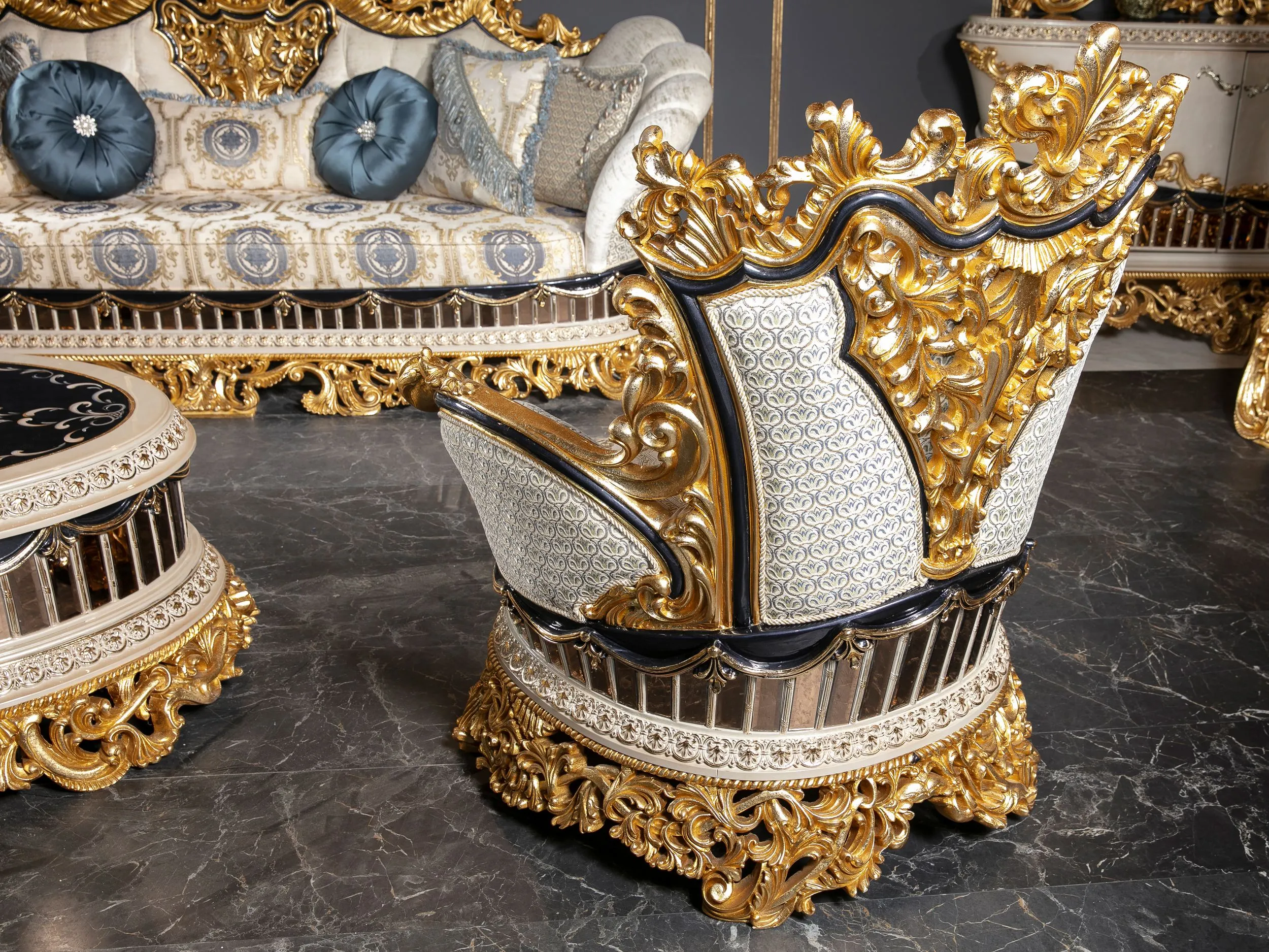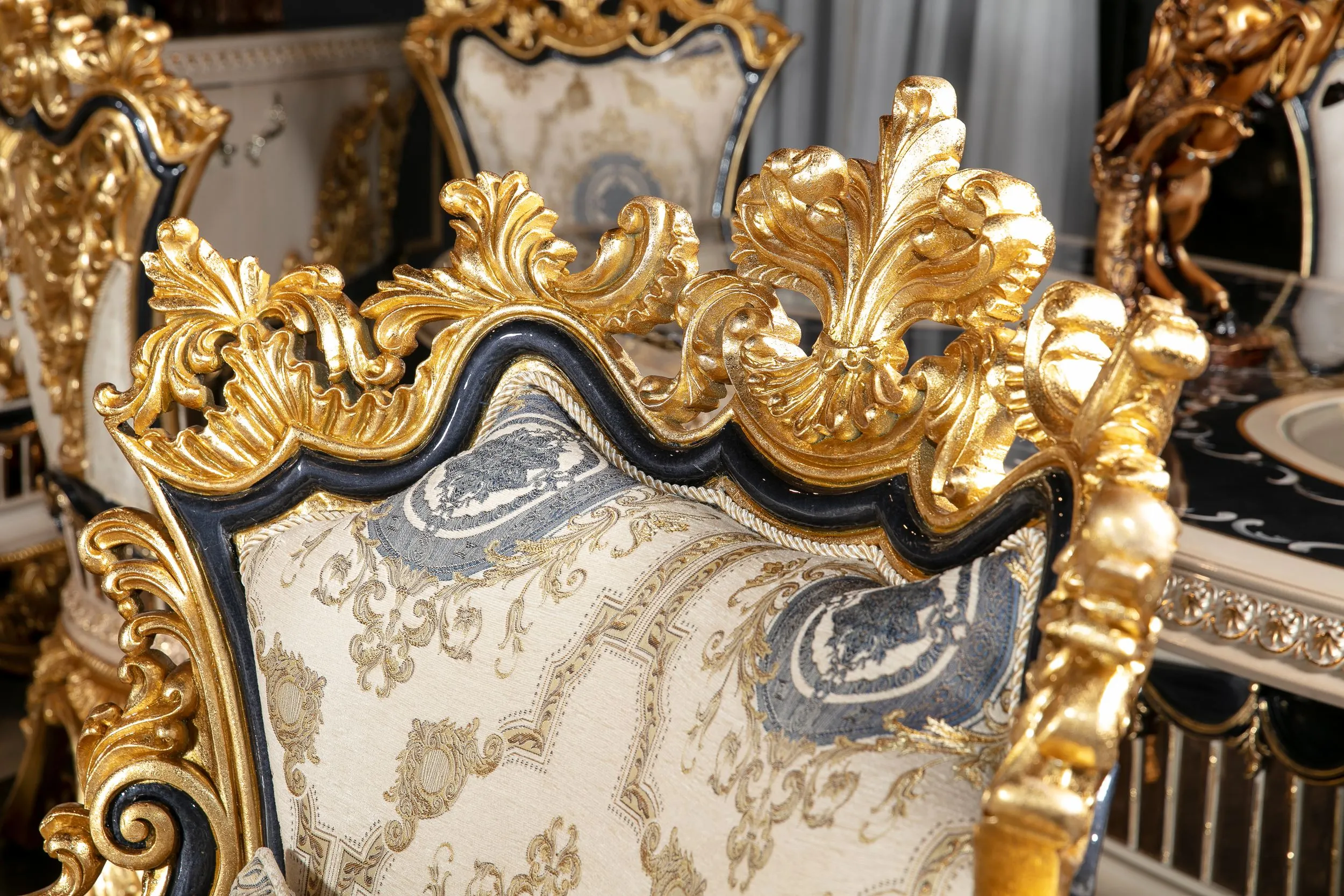 Takımın konforlu ve estetik sandalyeleri, uzun yemeklerde bile rahatlık sağlar. Zarif konsol ve vitrin gibi tamamlayıcı parçalar, yemek odanızda düzen sağlarken aynı zamanda dekoratif bir bütünlük oluşturur. Tac Mahal Mavi Yemek Odası Takımı, her detayıyla göz alıcı bir atmosfer yaratır ve sofralarınıza eşsiz bir zarafet kazandırır.